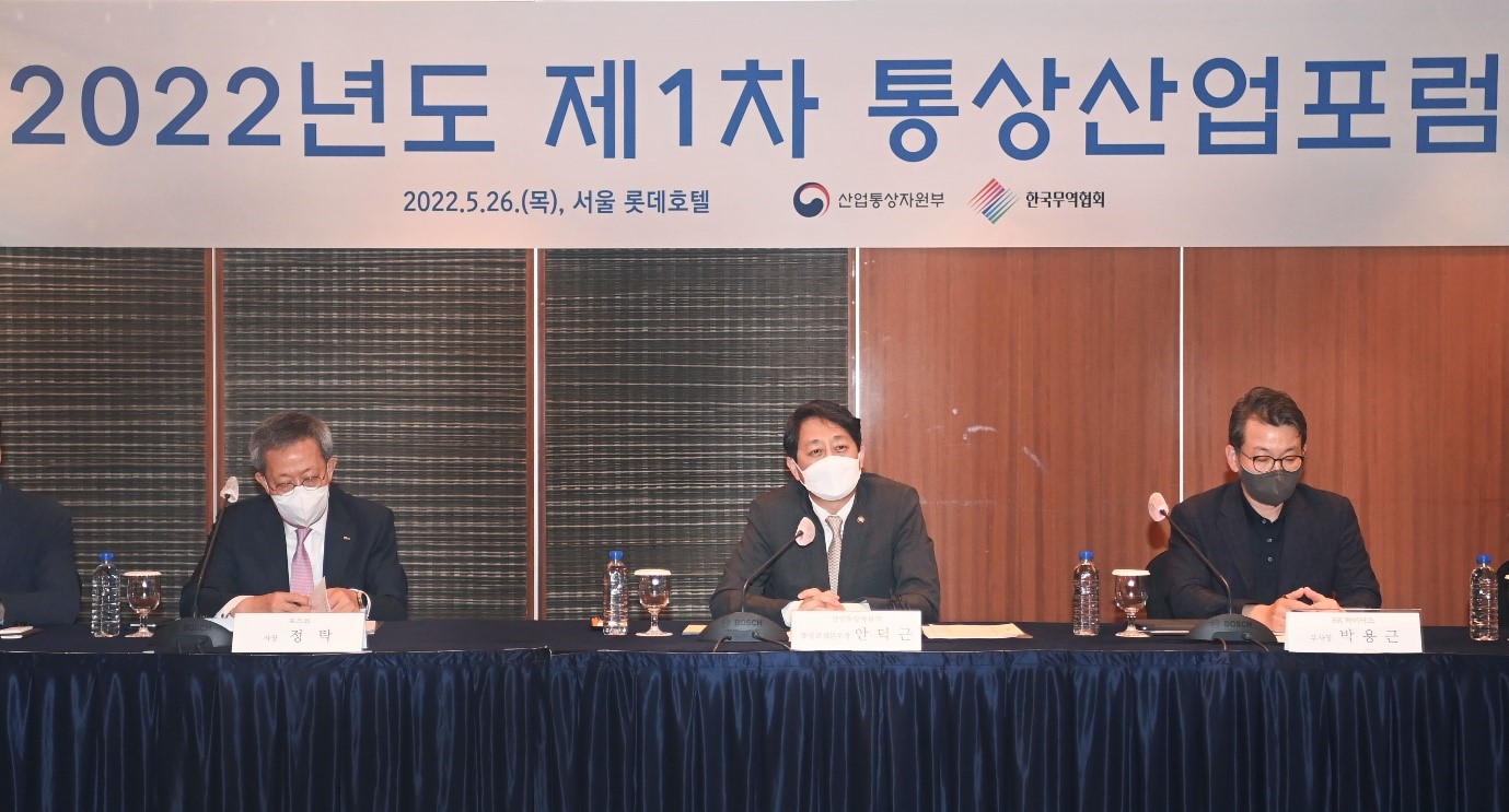 Trade Minister Ahn Duk-geun held the 1st Commerce Industry Forum on May 26 at the Lotte Hotel Seoul to share the major outcomes of the recent Korea-U.S. summit with industry representatives and discuss new trade policy directions in line with the changing global trade landscape as well as public-private cooperation measures with respect to Korea’s participation in the Indo-Pacific Economic Framework (IPEF). The event was attended by Korea International Trade Association (KITA) V date2022-05-31