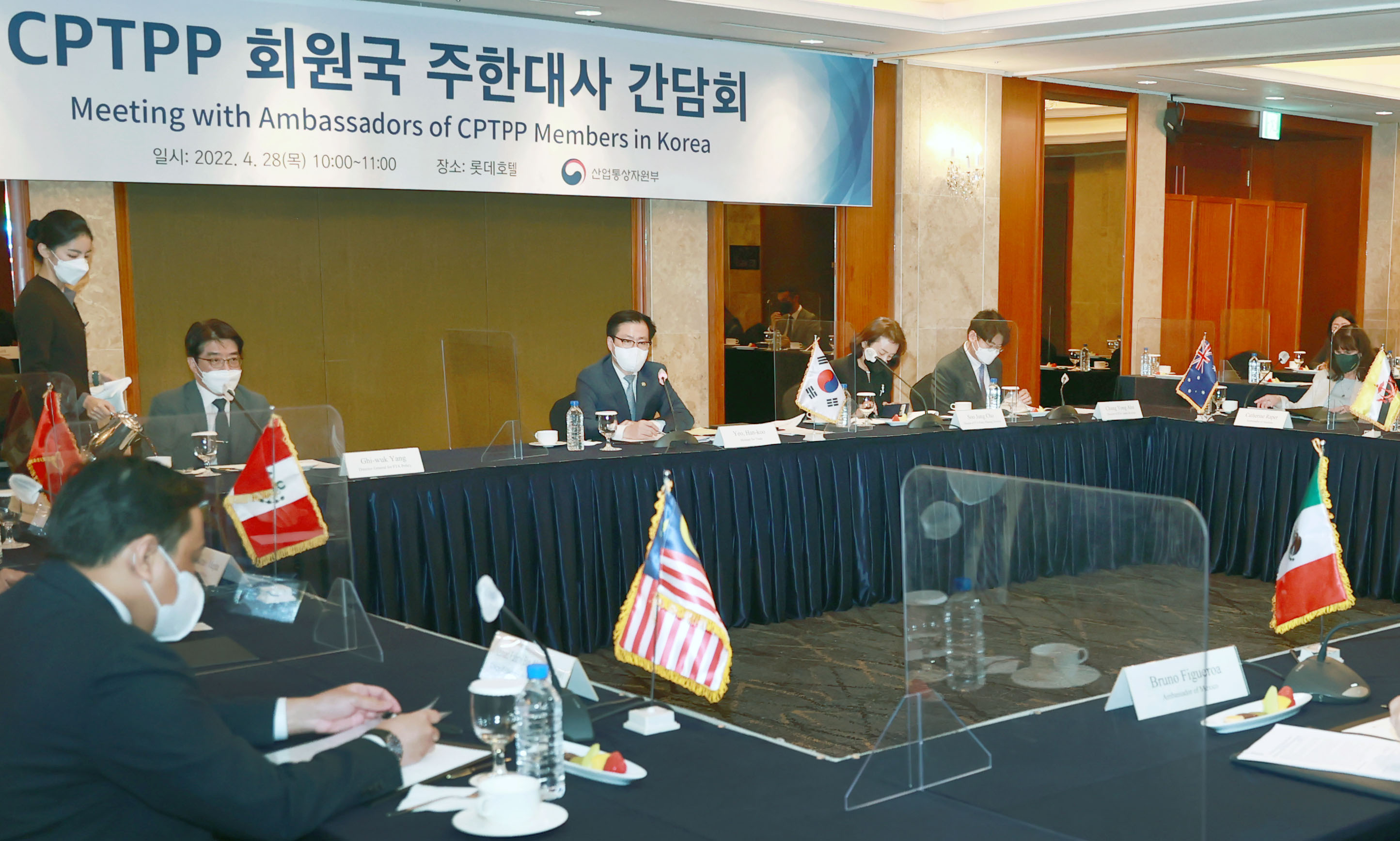Trade Minister Yeo Han-koo held a conference with the Comprehensive and Progressive Agreement for Trans-Pacific Partnership (CPTPP) member states’ ambassadors to Korea at the Lotte Hotel Seoul on April 28 to discuss Korea’s application and upcoming plans. The Minister delivered opening remarks and facilitated discussions addressing CPTPP’s role in terms of the Asia-Pacific trade order, as well as the Partnership’s future development direction. date2022-04-28