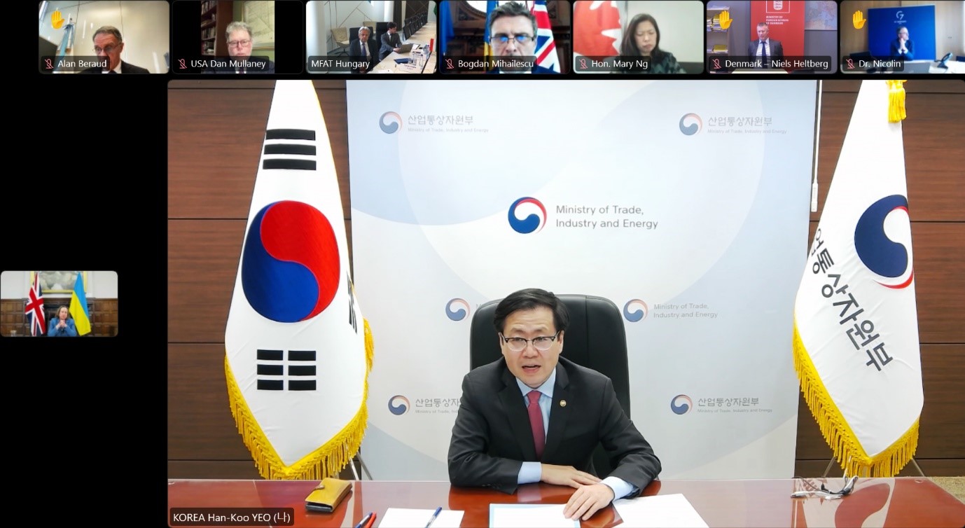 Trade Minister Yeo Han-koo attended the virtual Trade Ministers’ Meeting convened by the UK Secretary of State for International Trade Anne Marie Trevelyan on May 4 to discuss support for the people and economy of Ukraine. This meeting was held to strengthen solidarity and cooperation of the international community with respect to economic recovery assistance for Ukraine, and was proposed and held by the UK government. The U.S., Germany, France, Australia, and Japan were among the partici date2022-05-06