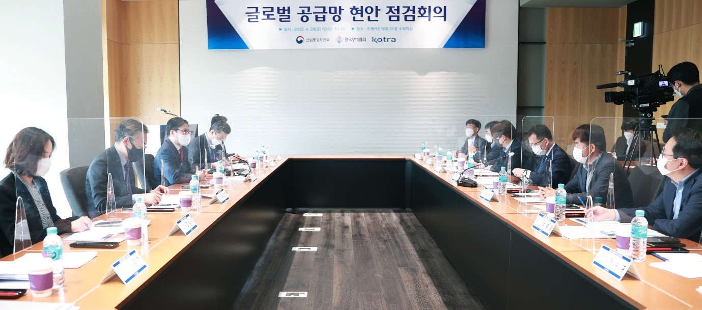 The Ministry of Trade, Industry and Energy (MOTIE)'s Trade Minister Yeo Han-koo held the Global Supply Chain Inspection Meeting at the Korea International Trade Association (KITA) office in Seoul on April 29 to address pending issues arising from ongoing external crises. Prior to presiding the meeting, the trade chief first visited the Global Supply Chain Analysis Center, a research center launched by MOTIE, KITA, and Korea Trade-Investment Promotion Agency (KOTRA), and purely devoted t date2022-04-29