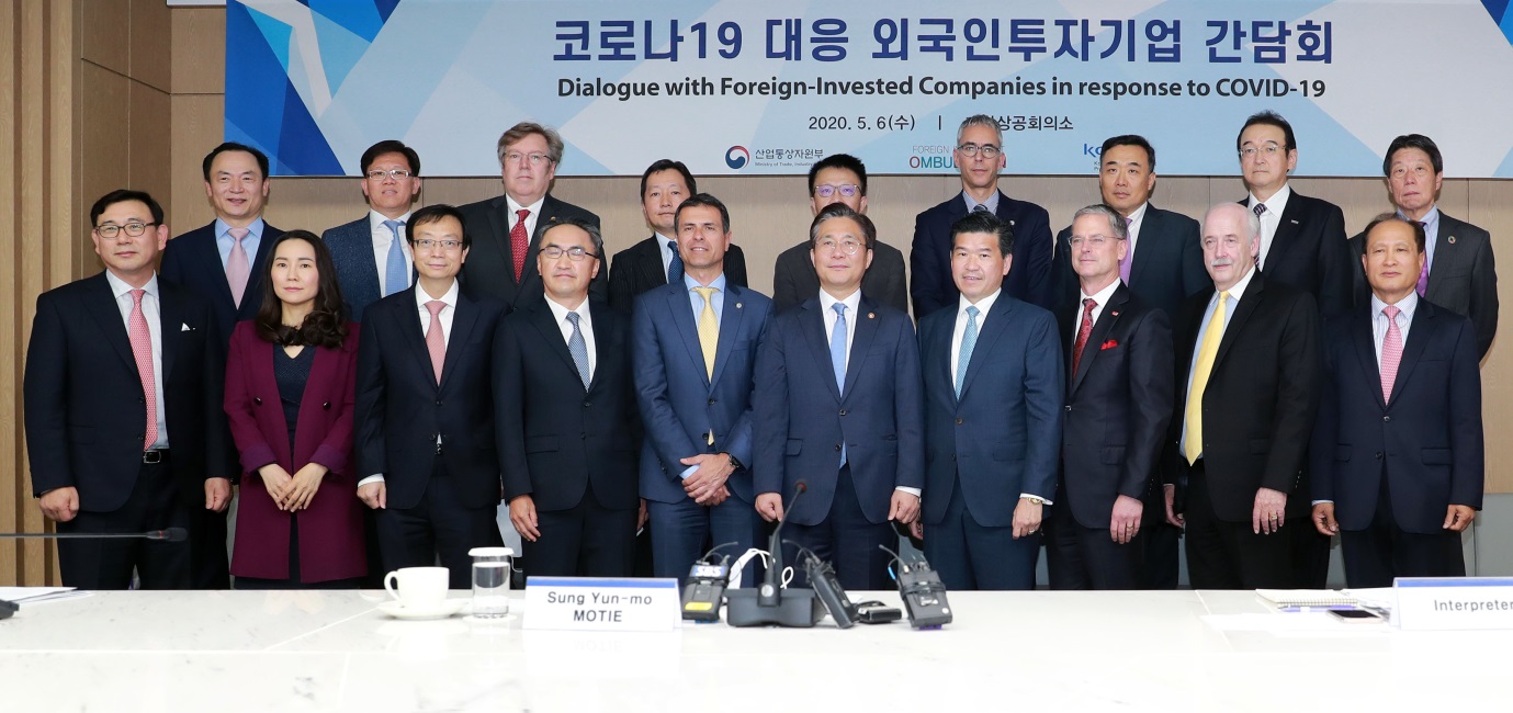 Trade, Industry and Energy Minister Sung Yun-mo (center) attended a dialogue with representatives from foreign-invested companies at Korea Chamber of Commerce and Industry headquarters, on May 6, to discuss cooperative measures for Korea’s economic recovery in the post-corona era. The businesses representatives praised Korea’s prompt and transparent leadership in responding to the virus and expressed willingness to mobilize all available resources in the course of COVID-19 r date2020-05-07