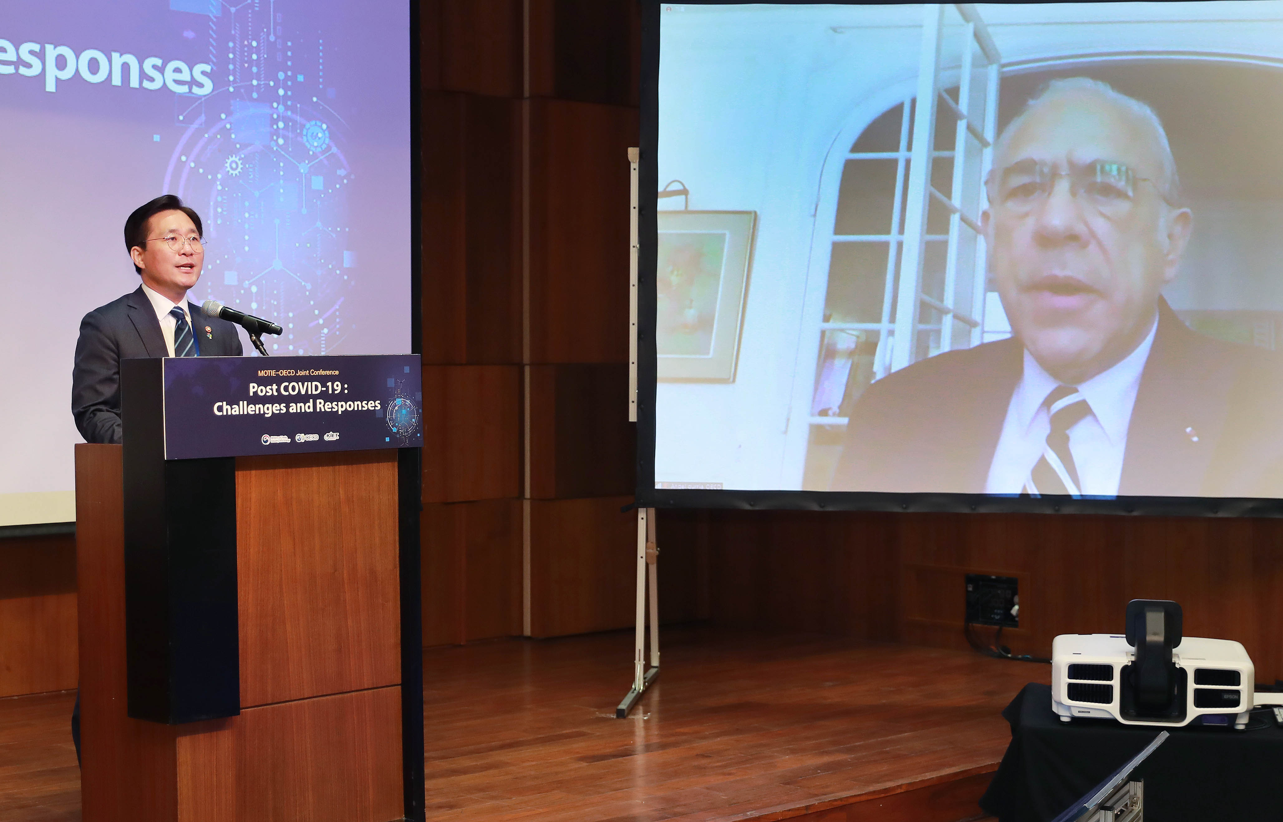 Trade, Industry and Energy Minister Sung Yun-mo held a joint video conference titled “MOTIE-OECD Joint Conference – Post COVID-19: Challenges and Responses” with Organization for Economic Cooperation and Development (OECD) Secretary-General Angel Gurría on June 18, to discuss post-corona responses to the industrial and trade orders. During his opening speech, Minister Sung suggested inter-connectivity, innovation, and inclusiveness as three key elements to the p date2020-06-18