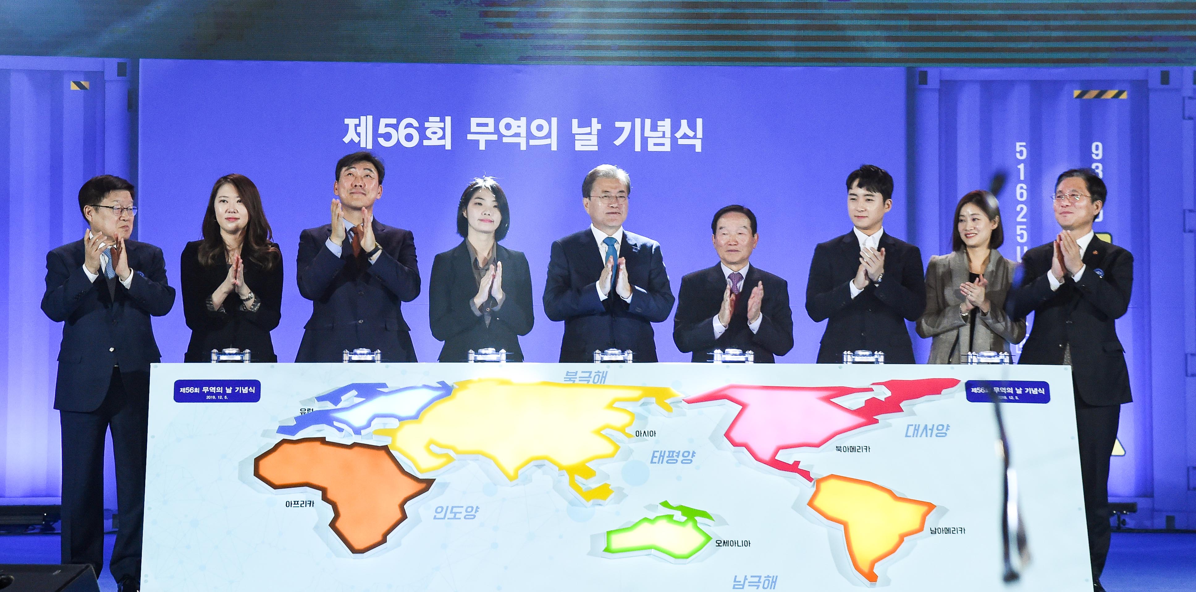 Trade, Industry and Energy Minister Sung Yun-mo (right) held Korea's 56th Trade Day Ceremony to celebrate this year’s trade achievement at COEX in Seoul on December 5. During the ceremony, Minister Sung expressed gratitude for the efforts and commitment of trade workers. The reception was attended by more than 2,000 trade experts and business leaders, including Korea International Trade Association (KITA) Chairman Kim Young Ju. date2019-12-06