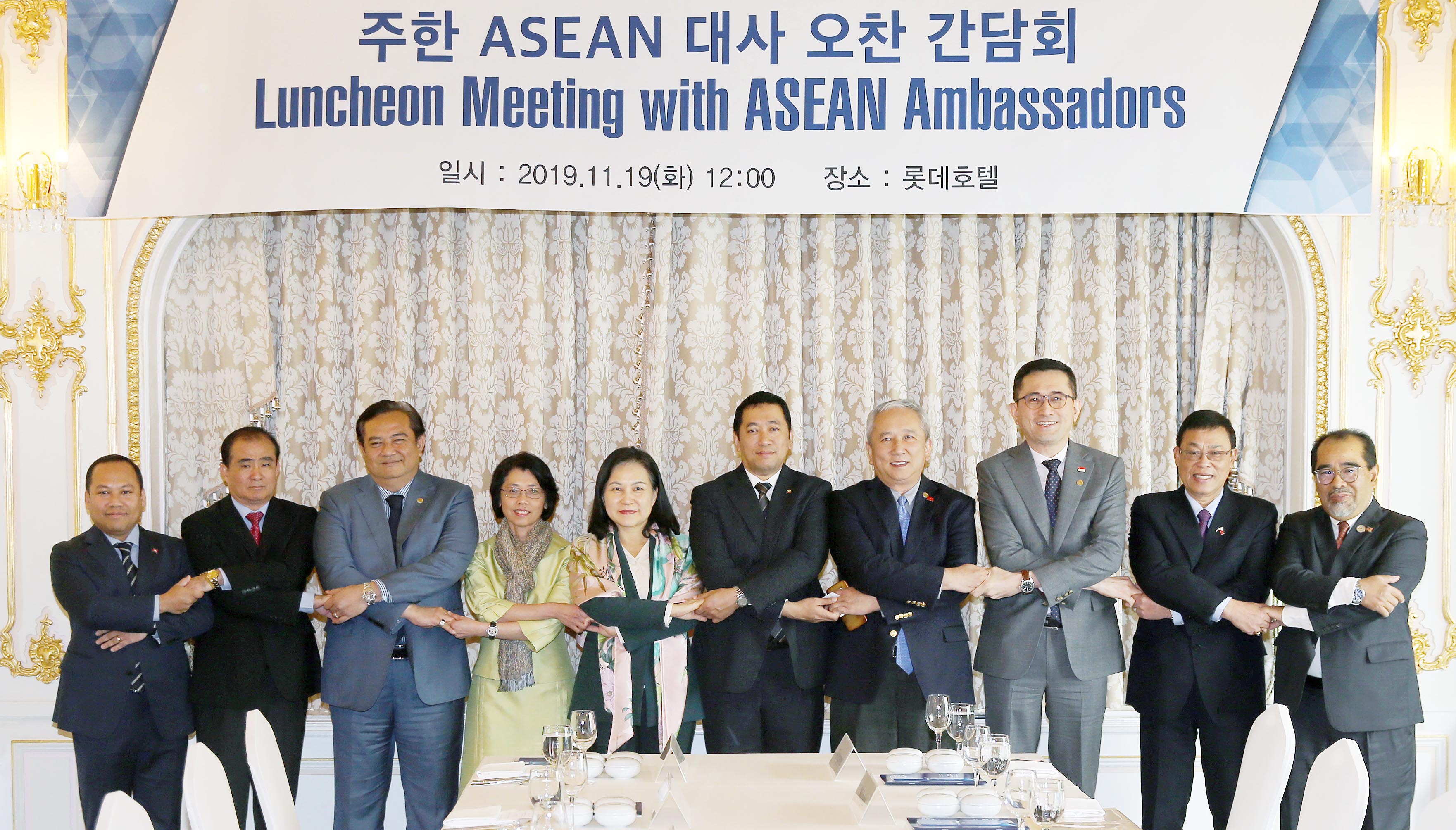 Trade Minister Yoo Myung-hee had a luncheon meeting with ambassadors to the Republic of Korea from Association of Southeast Asian Nations (ASEAN) countries in Seoul on November 19 ahead of the ASEAN-Korea Commemorative Summit.The Summit scheduled to be held in Busan from November 25 to 26 will commemorate the 30th anniversary of dialogue relations between Korea and ASEAN.The luncheon was organized to call for cooperation from participating nations of the Summit for its success and discuss the in date2019-11-19