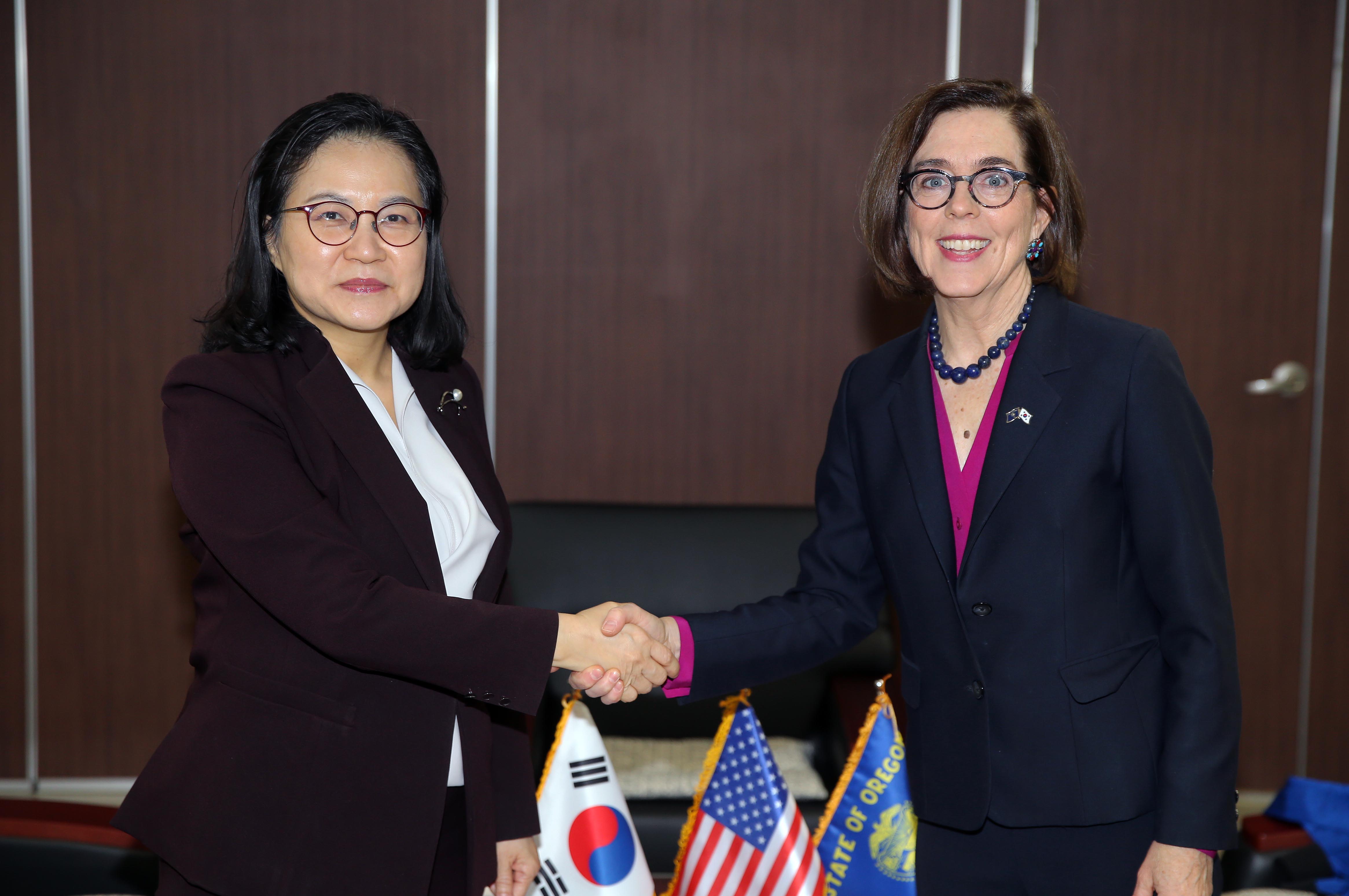 Trade Minister Yoo Myung-hee (left) discussed with Governor of Oregon Kate Brown how to further promote trade and investment between Korea and Oregon in Seoul on Nov 6. date2019-11-07