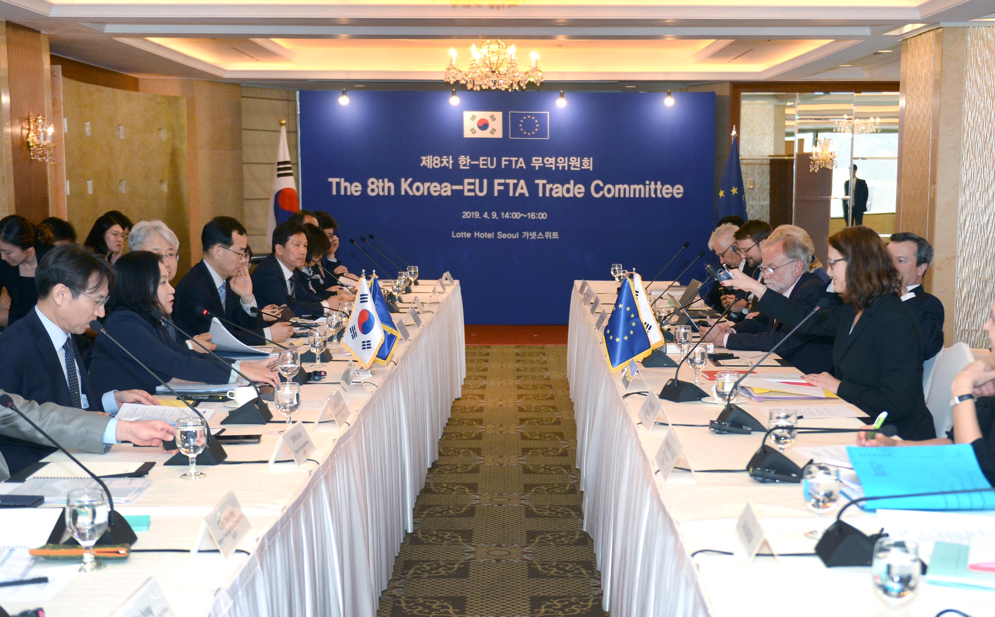 Trade Minister Yoo Myung-hee (second from the left) and European Commissioner for Trade Cecilia Malmström (right) co-chaired the eighth meeting of the Korea-EU Free Trade Agreement (FTA) Trade Committee in Seoul on April 9.On the occasion of this ministerial meeting, the two sides reviewed the implementation of the FTA, discussed bilateral trade issues, and explored ways to respond to global protectionism.The Korean officials and their EU counterparts discussed how to improve mutual market date2019-04-09