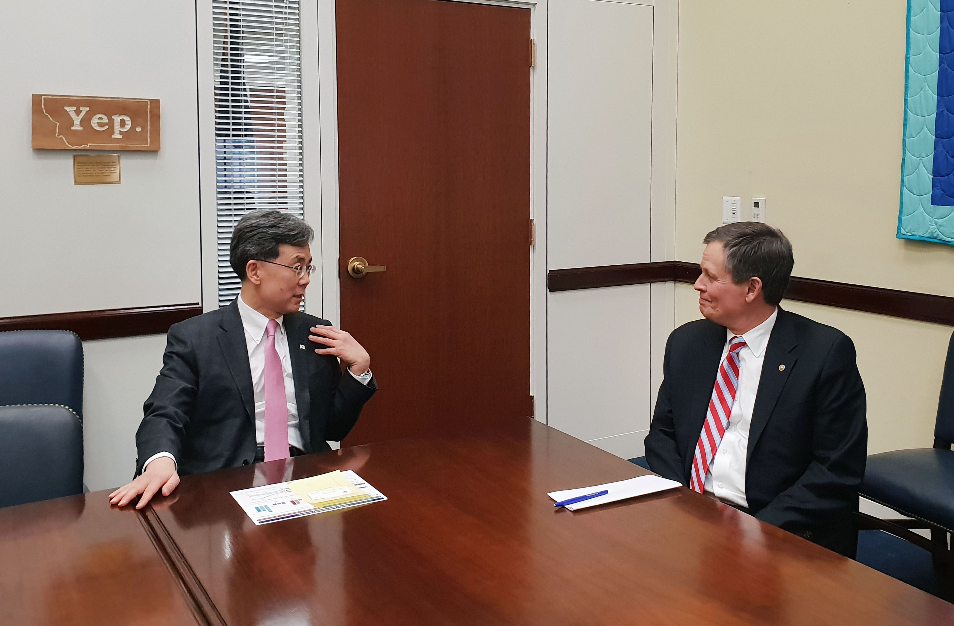 Trade Minister Kim Hyun-chong (left) met with U.S. Senator Steve Daines of Montana in Washington, D.C., on January 30 (local time) to explain Korea’s stance on the U.S. Commerce Department’s Section 232 probe into auto imports. date2019-01-31