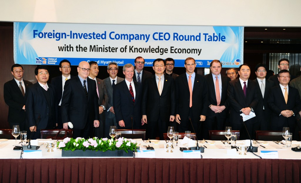 Minister of Knowledge Economy Sukwoo HONG stands with CEOs of foreign-invested companies on February 13 at the Grand Hyatt Hotel in Seoul. At the meeting, the Minister shared his thoughts about Korea’s investment environment with representatives of the American Chamber of Commerce in Korea, the European Union Chamber of Commerce in Korea and the Seoul Japan Club. date2012-02-21