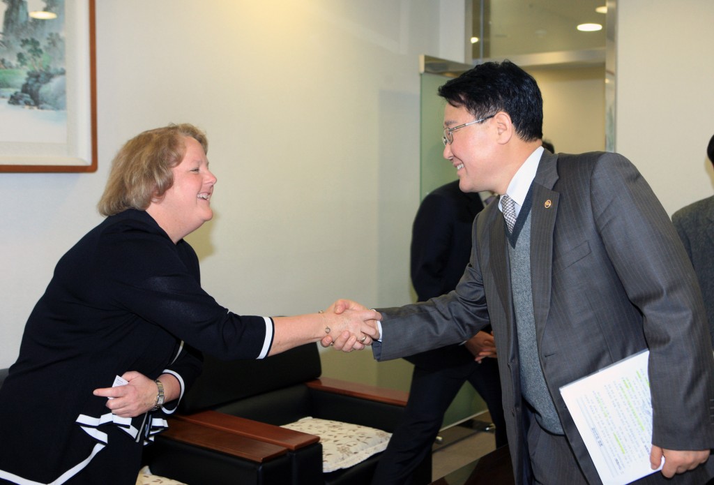 Vice Minister for Trade and Energy Cho Seok greets U.S. Chamber of Commerce Vice President for Asia Tami Overby in Seoul on January 9. The two shared ideas about how best to use the Korea-U.S. FTA to strengthen economic ties. date2012-01-12