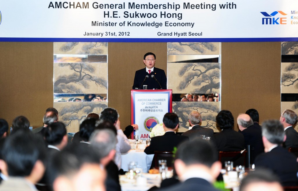 Minister of Knowledge Economy Sukwoo HONG addresses about 100 U.S. business leaders at the American Chamber of Commerce in Korea General Membership Meeting on January 31 in Seoul. date2012-02-06