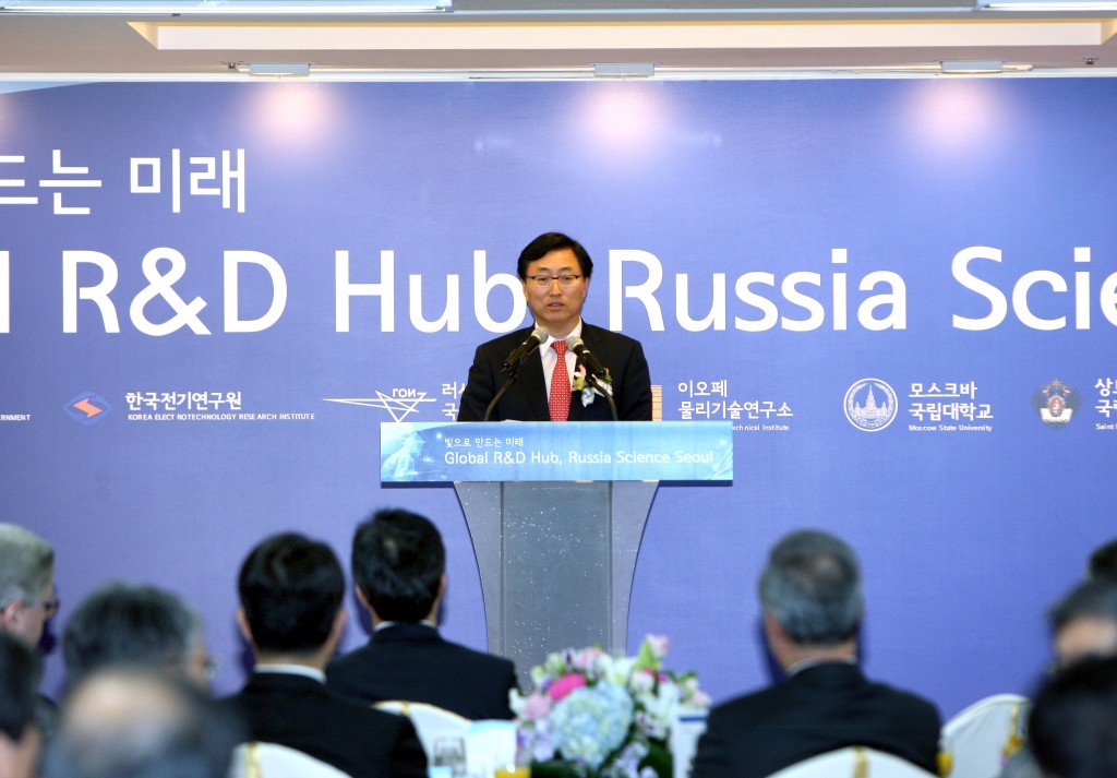 Korea, Russia Open Joint Technology Center Minister of Knowledge Economy Choi Joong-Kyung addresses representatives of government bodies, businesses and research institutes from Korea and Russia at the opening ceremony for a joint technology center on February 24 in Seoul. date2011-03-02