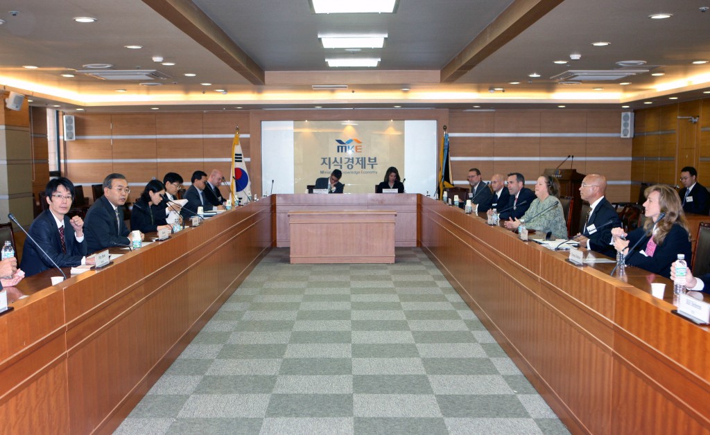 Vice Minister for Trade and Energy Park Young June (third from left) presides over a meeting in Gwacheon on October 15. Nearly 20 representatives of the U.S.-Korea FTA Business Coalition attended the meeting, which focused on investment, the Korea-U.S. FTA, and the industrial technology partnership between the two countries. The Coalition is composed of companies, industry associations, and other FTA supporters who would like to see the deal ratified at an early date. date2010-10-18