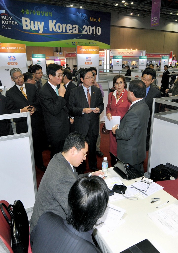 Vice Minister for Trade and Energy Kim Young Hak listens to a businessman at “Buy Korea 2010” on March 4 in Goyang, north of Seoul. The trade event was held to match local companies with overseas buyers. date2010-03-16