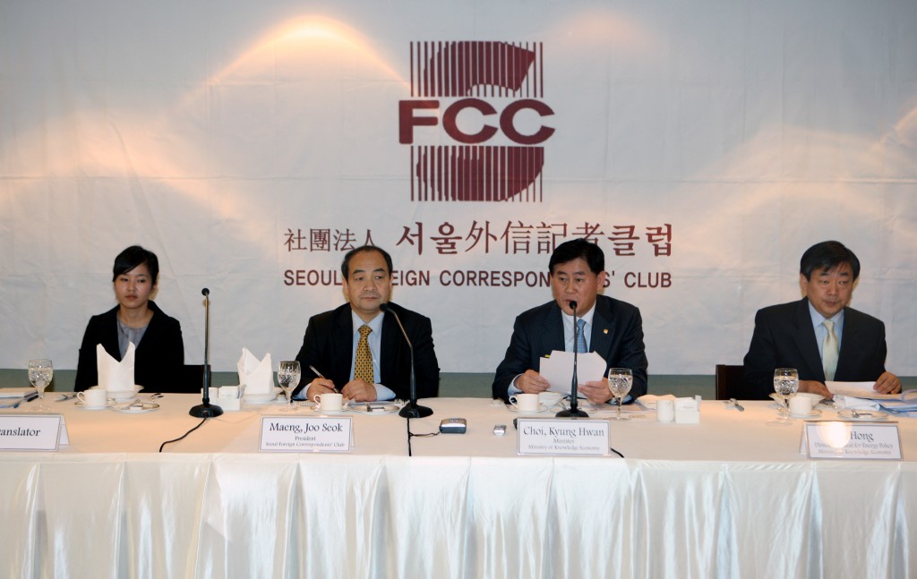 Minister Meets Foreign Correspondents in Korea Minster of Knowledge Economy Choi Kyunghwan (second from right) addresses a group of foreign correspondents in Seoul on December 1. Minster Choi discussed Korea’s efforts to reduce greenhouse gas emissions. date2009-12-02