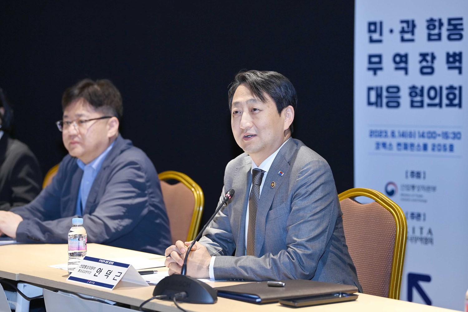 Minister for Trade Dukgeun Ahn chaired the public-private joint trade barrier response committee meeting on June 14 at COEX in Seoul to facilitate discussions on non-tariff barrier issues and other major countries’ import regulations to revitalize exports. The trade chief gave an opening message and led discussions on response measures against import regulations and overseas non-tariff barrier issues. The meeting was attended by representatives of relevant ministries date2023-06-16