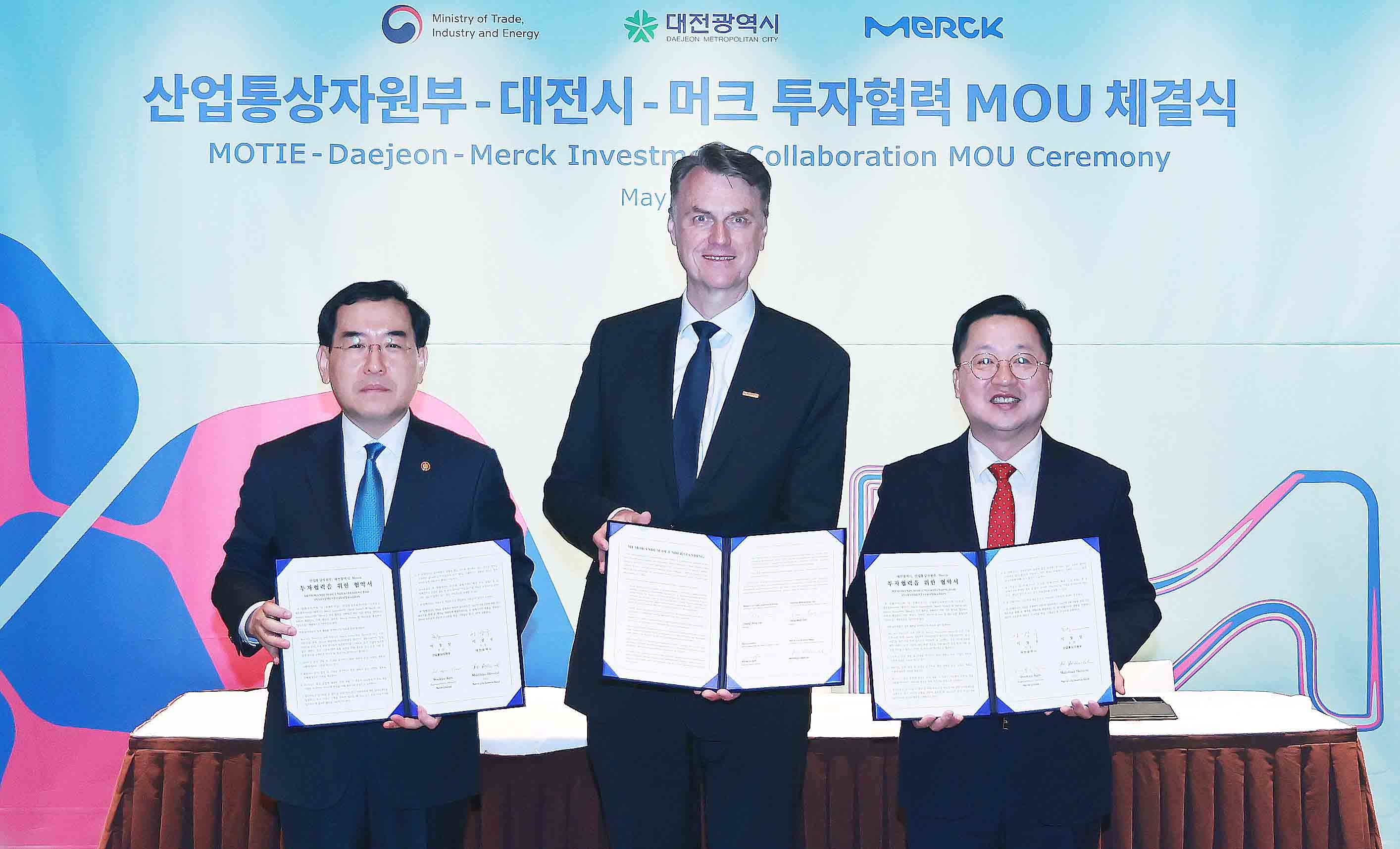 The Ministry of Trade, Industry and Energy (MOTIE) announced on May 3 that MOTIE, Daejeon Metropolitan City and Merck Life Science (“Merck”) signed an investment cooperation memorandum of understanding (MOU) at the Grand Hyatt Seoul on plans to establish a new bioprocessing unit in Korea for producing biomedical raw and subsidiary materials in the Asia-Pacific region. date2023-05-08