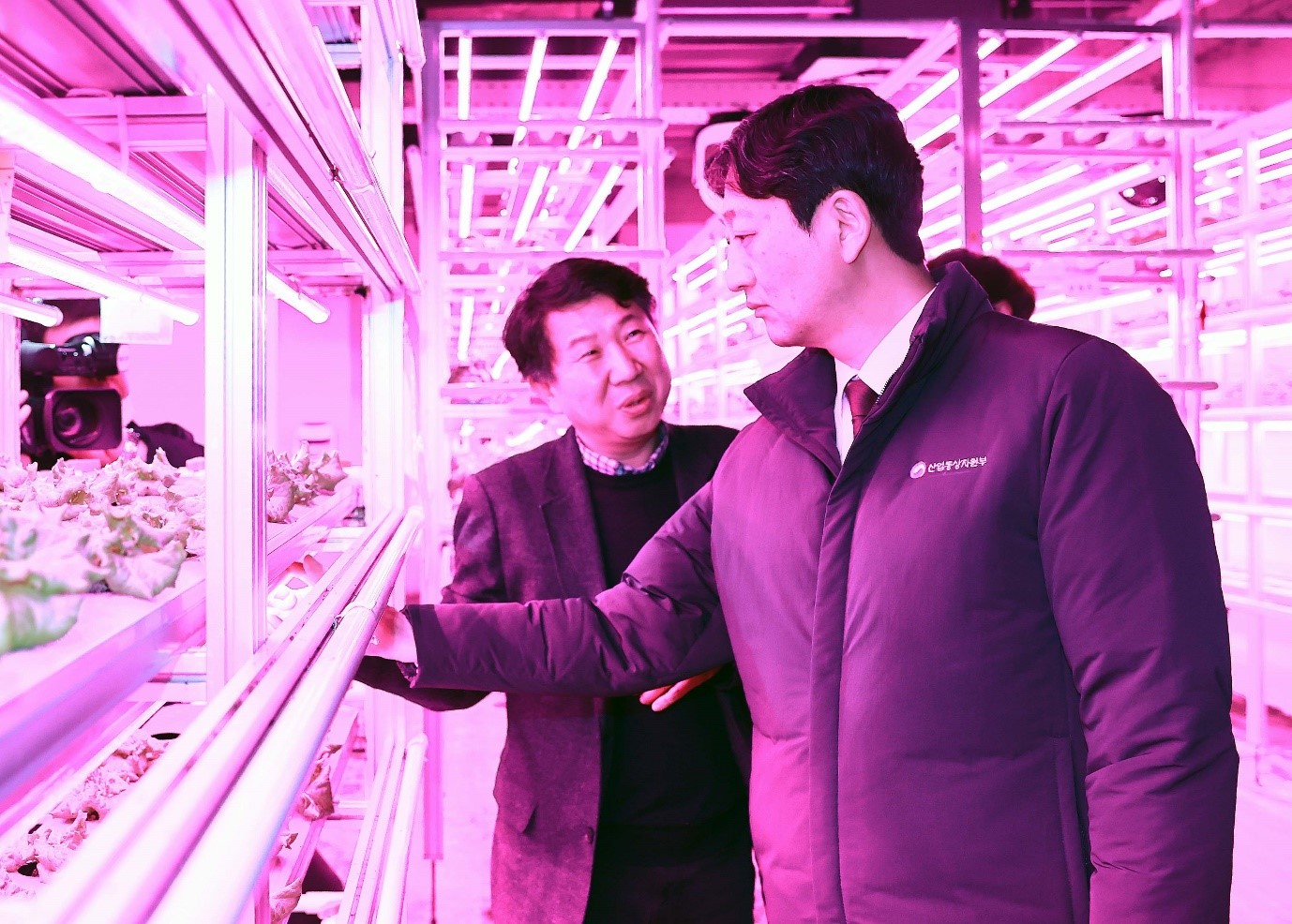 Minister for Trade Dukgeun Ahn visited NextOn, a smart farming company in Seocho-gu, Seoul, on January 26 to tour the smart farm cultivation site and discuss measures to counter obstacles faced by domestic exporters. Trade Minister Ahn was briefed by NextOn CEO Choi Jae-bin on company management and challenges before touring the site and encouraging employees. date2023-01-30