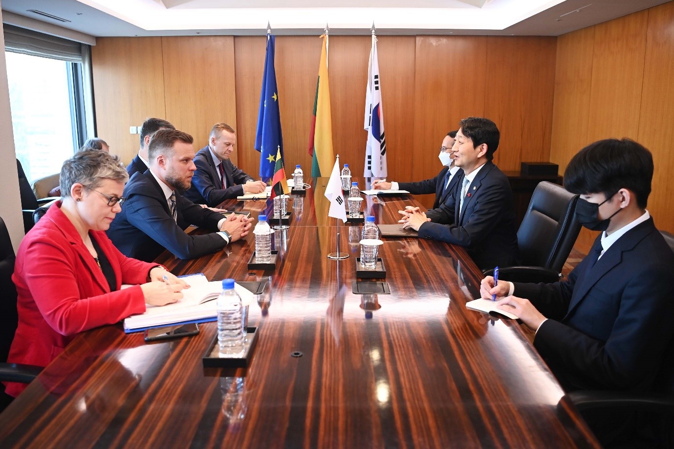 Minister for Trade Dukgeun Ahn met with Lithuania’s Foreign Affairs Minister Gabrielius Landsbergis on January 12 in Seoul to discuss measures to strengthen bilateral economic and trade cooperation and also requested support for World Expo 2030 Busan. Minister Landsbergis mentioned that Lithuanian companies specializing in LNG (Klaipedos Nafta), laser (Light Conversion) and EV charging (In Balance Grid) had accompanied him on his visit to hold talks with Korean companies like Samsung Disp date2023-01-16