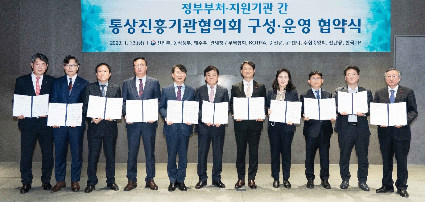 Minister for Trade Dukgeun Ahn held an MOU signing ceremony with the Trade Promotion Institutions Committee on January 13 in Seoul to promote close communication and cooperation between the Government and exports supporting institutions amid the rapidly changing trade environment. The event was attended by representatives of relevant ministries and institutions, including the Ministry of SMEs and Startups, Korea Customs Service, Korea International Trade Association (KITA) and Korea Tra date2023-01-16