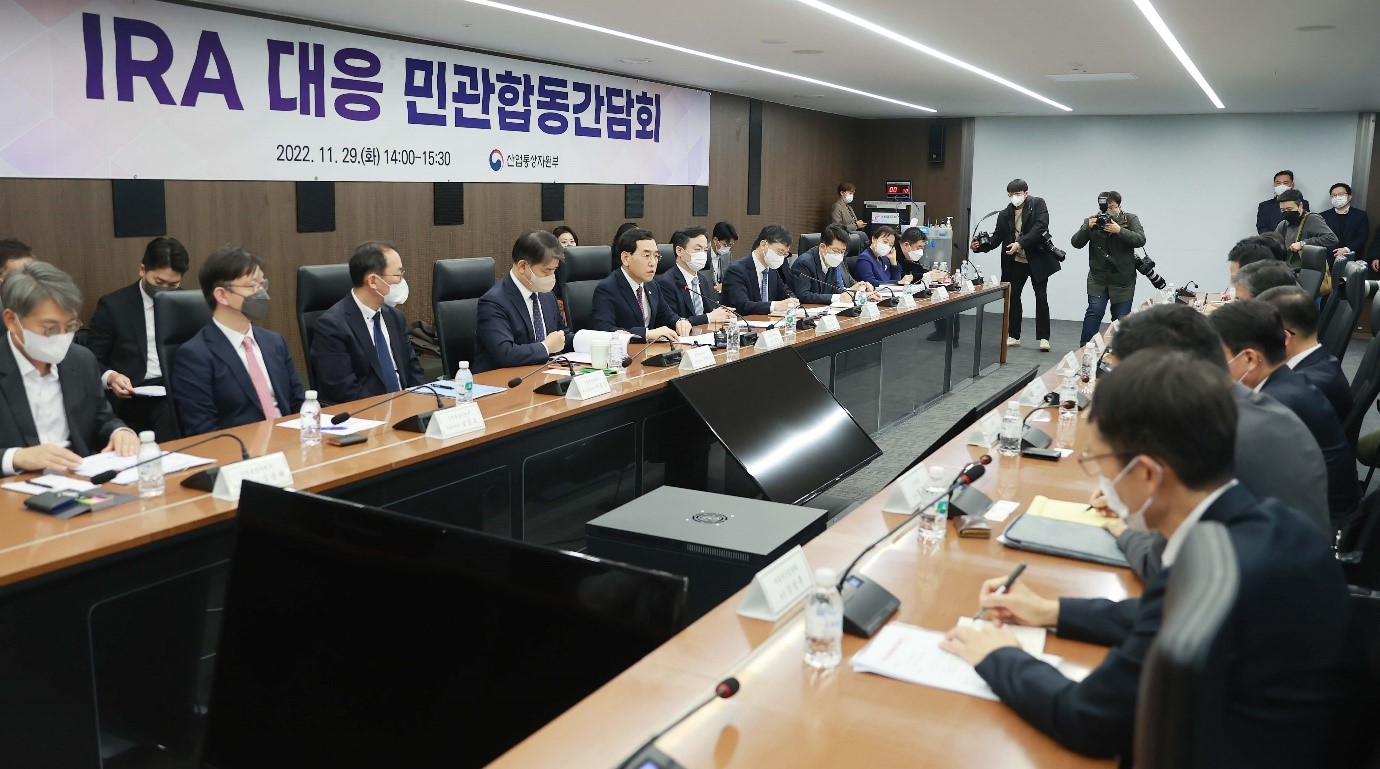 Trade, Industry and Energy Minister Lee Chang-yang convened a public-private joint conference on November 29 at the Korea Chamber of Commerce and Industry (KCCI) and led discussions on the U.S.’ Inflation Reduction Act (IRA) to gather opinions and assess the situation to seek response measures prior to IRA enforcement beginning January 2023. Attendees included representatives from eight companies and associations, including Hyundai Motor, Samsung SDI, LG Energy Solution, Korea Aut date2022-12-01