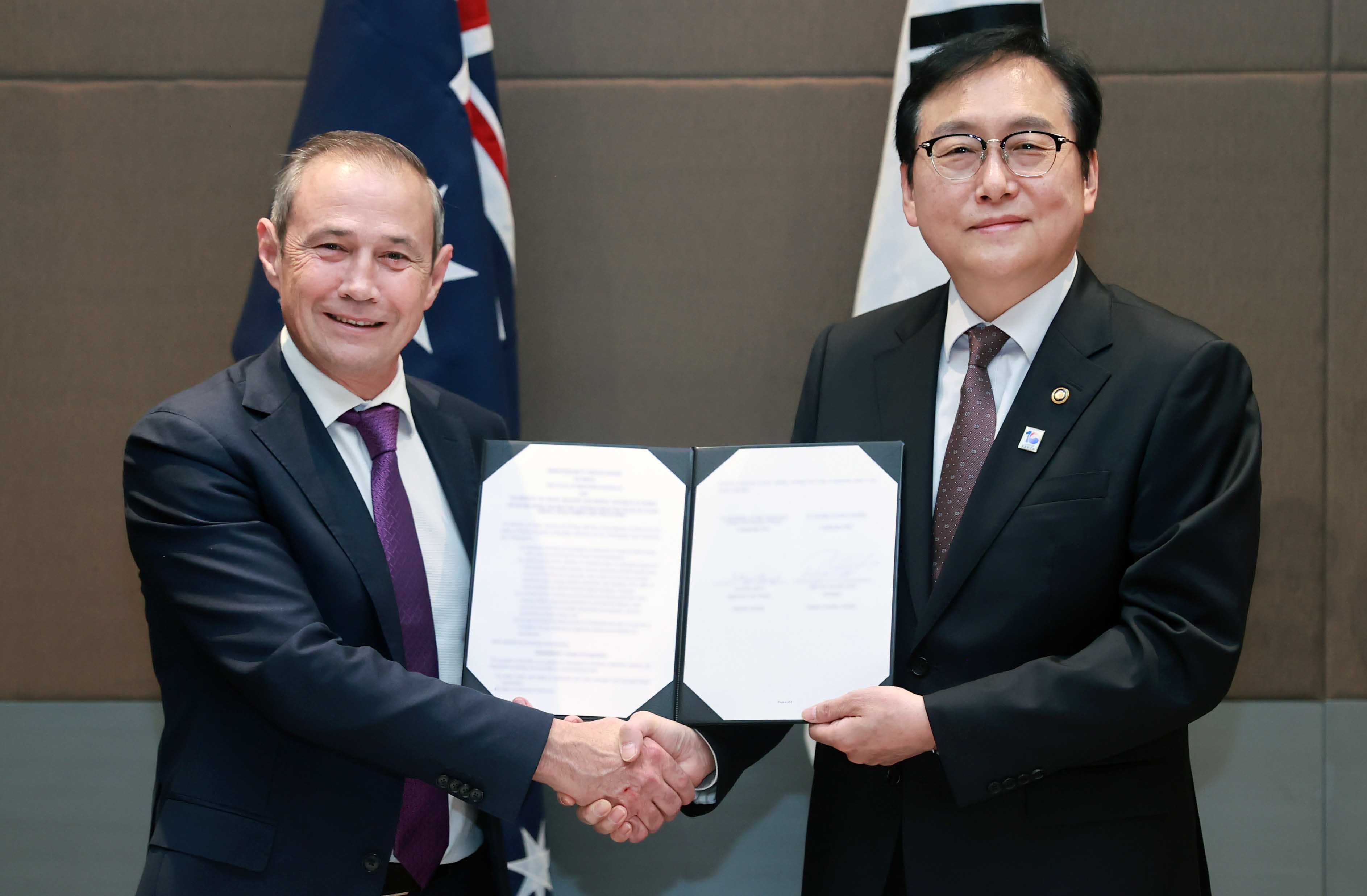 Korea's Minister for Trade Inkyo Cheong and Western Australia Premier Roger Cook signed the memorandum of understanding (MOU) between the Ministry of Trade, Industry and Energy (MOTIE) and the Government of Western Australia on September 3 in Perth for establishing the groundwork for clean energy development and processing cooperation. date2024-09-03
