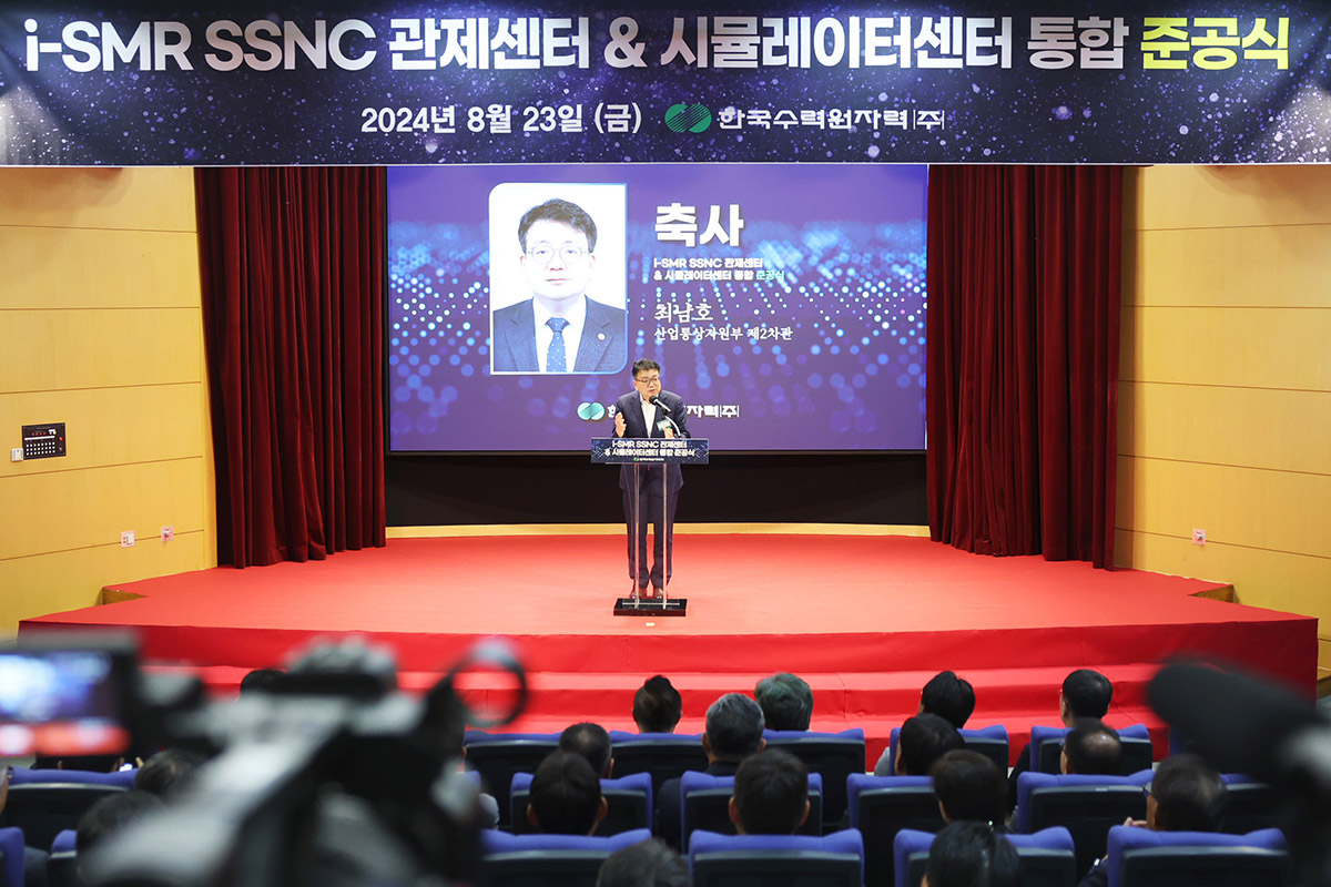 Trade, Industry and Energy Vice Minister Namho Choe attended the completion ceremony of the i-SMR Simulator Center and SMR Smart Net-Zero City (SSNC) control center today at the Korea Hydro & Nuclear Power (KHNP)'s central R&D center in Daejeon. The ceremony was held with the participation of 70 key figures from related industries, academia, and research institutions, including 2050 Presidential Commission on Carbon Neutrality and Green Growth Chairperson Kim Sang-hyup and KHNP CEO Whang Joo-ho. An innovative small modular reactor (i-SMR) is Korea’s homegrown SMR with a tenth of the large-sized reactor’s power capacity but built with enhanced safety and operation flexibility. In 2022, the Korean government launched a prefeasibility study for the i-SMR development project following the Atomic Energy Commission (AEC)’s deliberations in 2020, with aim to obtain the standard design approval for i-SMRs by 2028. The completed i-SMR Simulator Center will be used to verify SMRs’ optimal design and operation adequacy. It will also serve as a venue for training reactor operators and for performing and strengthening safety inspections through emergency drills inside a mock-up identical to the actual main control room. The data gained from the simulator will play a central role in the process of obtaining the i-SMR design approval and going forward, an operation license required for activation. For Korea to become a global leader in SMRs, Vice Minister Choe highlighted in his congratulatory message that not only is it important to develop reactors, but to conduct thorough safety inspections and talent training as well. He requested that KHNP and related institutions actively take part in the simulator design verification and operation training, vowing that the Government will provide consistent support for demonstration projects and paving the way towards commercialization in light of SMRs’ initial incorporation into the working-level draft of the 11th Basic Plan for Power Supply and Demand. In his keynote speech, KHNP CEO Whang addressed measures for leveraging i-SMRs to foster the SMR Smart Net-Zero City (SSNC) and emphasized that SMRs are a major alternative for climate crisis response. date2024-08-23