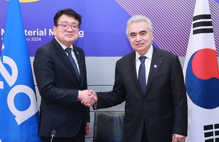 International Energy Agency(IEA) Ministerial Communique, the first to recognize the role of nuclear energy to address the climate crisis and improve energy security - Vice Minister Namho Choe met with IEA Executive Director Dr. Fatih Birol at the 2024 IEA Ministerial - IEA and Korea agree to launch a joint study on carbon-free energy On February 14th, Vice Minister Namho Choe from the Ministry of Trade, Industry and Energy (MOTIE) attended the IEA Ministerial in celebration of the IEA’s 50th anniversary. During this Ministerial meeting, IEA Member States reaffirmed their dedication to deploying clean energy and ensuring energy security. Member States adopted the IEA Ministerial Communiqué, which is the first-ever multilateral agreement that recognizes the crucial role of nuclear power as a clean source to reduce dependence on fossil fuels. Additionally, the Communiqué emphasizes the need to accelerate the deployment of various carbon-free energy technologies tailored to national circumstances and choices. This achievement is significant for many countries, including Korea, which is dedicated to achieving carbon neutrality. Moreover, governments, industries, academies, and experts participating in the IEA Ministerial engaged in a substantive discussion on accelerating global transitions. Korea presented its dedication to contributing to the global clean energy transition in light of its excellent commercialized carbon-free energy technologies and manufacturing-skilled industries. Vice Minister Namho Choe met with IEA Executive Director Dr. Fatih Birol at the margins of 2024 IEA Ministerial and expressed their commitment to continued cooperation for a sustainable energy future. The IEA and Korea have agreed to intensify collaboration through a joint study on carbon-free energy utilization conditions in major countries this year. “To achieve net-zero emissions by 2050, the world needs to rapidly improve energy efficiency and accelerate the deployment of carbon-free technologies, including renewables, hydrogen, ammonia, CCUS and nuclear power in those countries that choose to use it. Against this backdrop, I hope the joint study we are doing with Korea on carbon-free energy will be a useful input to guide countries towards their energy and climate goals.” Dr. Fatih Birol said. “I look forward to further deepening our partnership with Korea following the extremely productive exchange we had today.” “Korean companies possess a competitive edge in the manufacturing technology of various clean energy fields, including batteries, semiconductors, nuclear power, renewable energy, and hydrogen. It is the unwavering commitment of Korea to contribute to establishing global energy security and accelerating the transition towards clean energy”, Vice Minister Choe stated, “I would like to express my appreciation for Dr. Birol’s leadership in guiding our responses through the energy crisis and for his dedication to ensuring that the IEA plays a key role in sustaining the global transition towards clean energy.” date2024-02-15