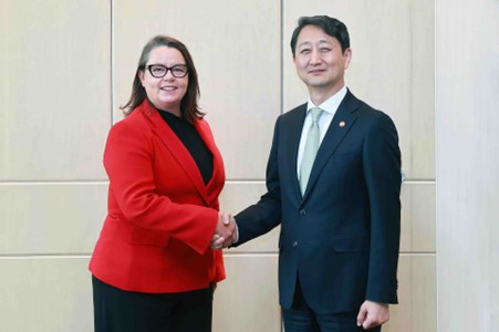 Trade, Industry and Energy Minister Dukgeun Ahn met with Madeleine King, Australia’s Minister for Resources and Minister for Northern Australia, on February 2 in Seoul to discuss bilateral cooperation measures in energy and resources areas, including critical minerals, carbon capture and storage (CCS) and natural gas, as well as issues faced by Korean companies in relation with Australia’s energy regulations. Both countries shared the need to diversify the supply chain and reduce reliance on other countries for critical minerals and agreed to make further effort to expand their scope of cooperation from upstream areas like exploration, development and production to downstream areas like refining, smelting and processing. Next, the two ministers agreed to promptly proceed with procedures necessary for the Korea-Australia CO2 transport agreement to smoothly implement the CCS investment project for transporting the CO2 captured in Korea for permanent storage in Australia’s depleted gas reservoirs. Minister Ahn conveyed the concerns expressed by Korean firms regarding the extension of the Australian Domestic Gas Security Mechanism (ADGSM) to 2030 and asked for clarification of the Australian safeguard mechanism standards of carbon emission reduction duties on greenhouse gas emissions-intensive facilities. date2024-02-05