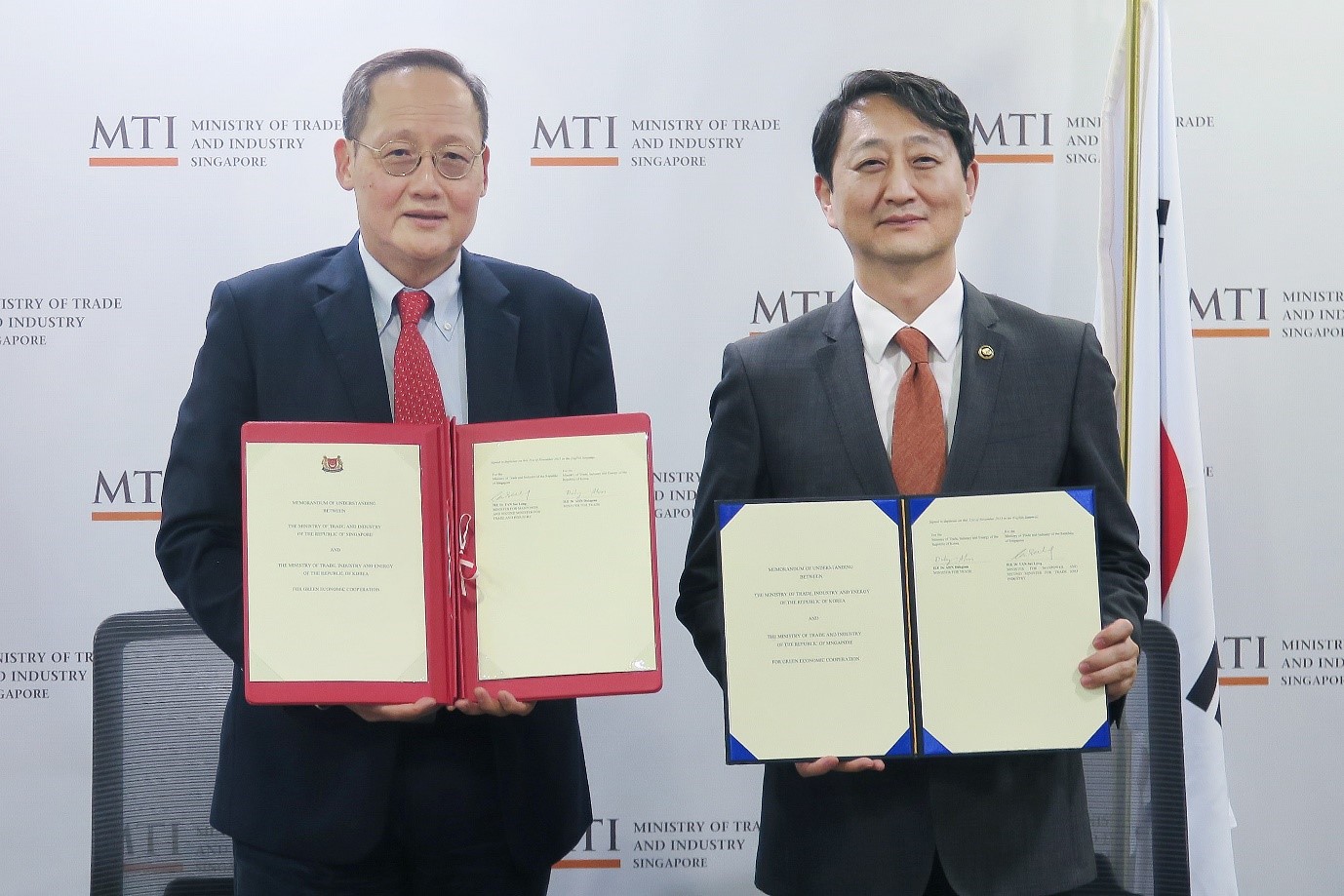 Minister for Trade Dukgeun Ahn and Singapore's Second Minister for Trade and Industry Tan See Leng attended the signing ceremony for Korea-Singapore Green Economy memorandum of understanding (MOU) on November 21 in Singapore for cooperation in expanding the use of clean energy and achieving carbon neutrality. date2023-11-24
