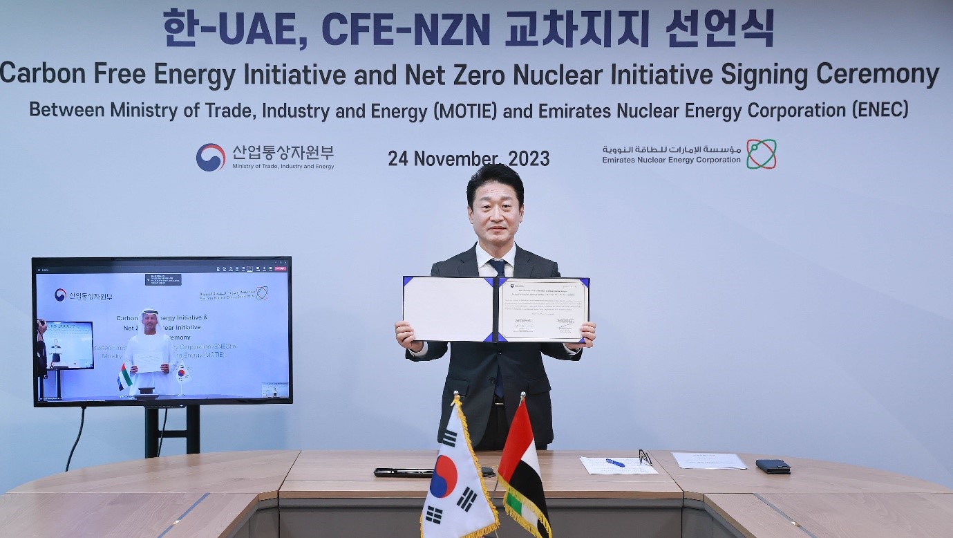 Trade, Industry and Energy Ministry's Deputy Minister for Energy Policy Lee Ho-hyeon held the Carbon Free Energy Initiative and Net Zero Nuclear Initiative Signing Ceremony on November 24 via videoconferencing for mutual support declaration between MOTIE and the UAE’s Emirates Nuclear Energy Corporation (ENEC). date2023-11-28