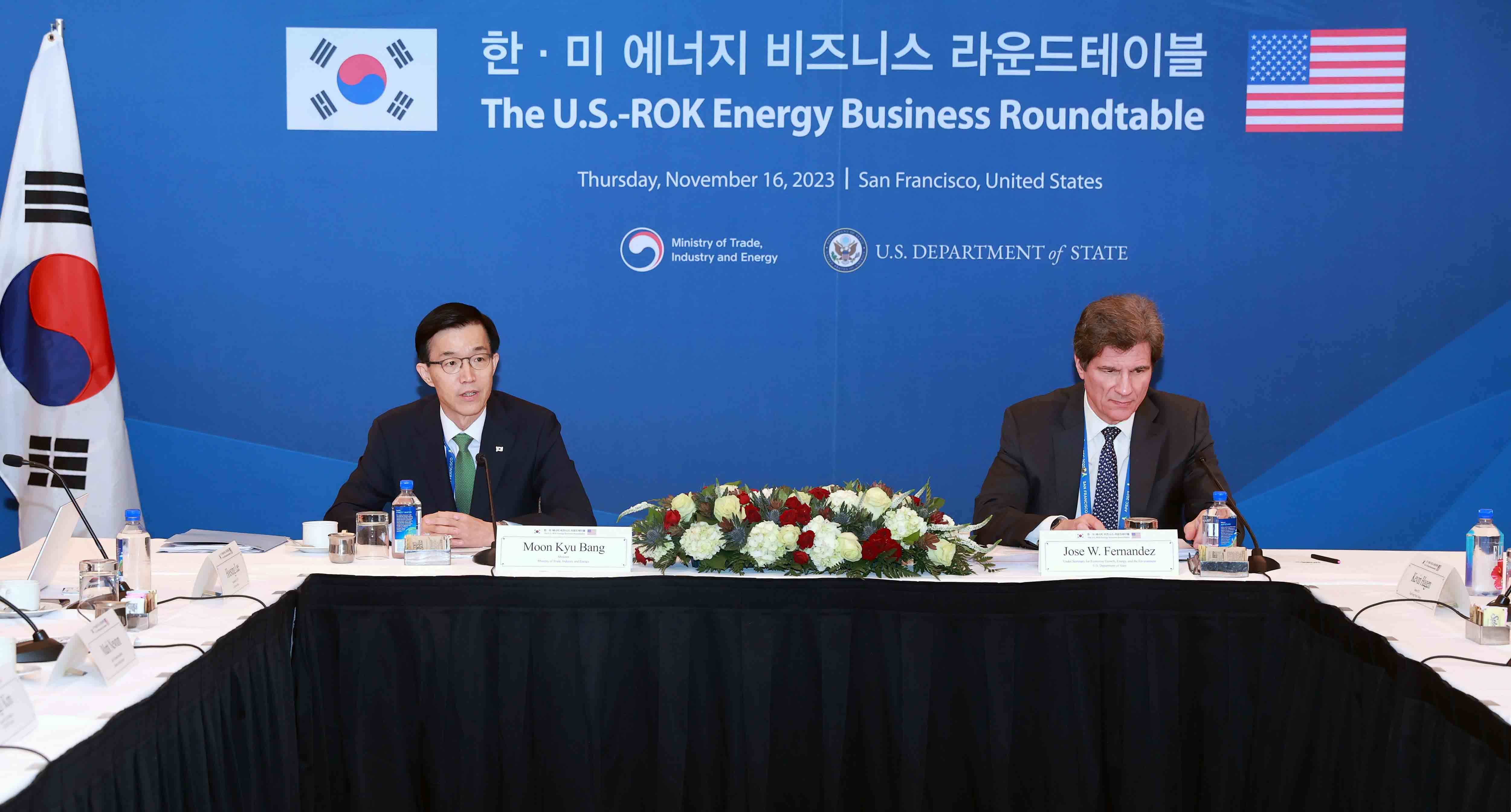 Trade, Industry and Energy Minister Bang Moon Kyu and U.S. Under Secretary of State for Economic Growth, Energy, and the Environment Jose W. Fernandez led the 'Korea-U.S. Clean Energy Business Roundtable' held on the sidelines of the APEC Leaders’ Summit on November 16 in San Francisco. The roundtable was held to facilitate discussions on the need for carbon free energy sources, investment in energy infrastructure and challenges and tasks in expanding carbon free energy and clean power. T date2023-11-20