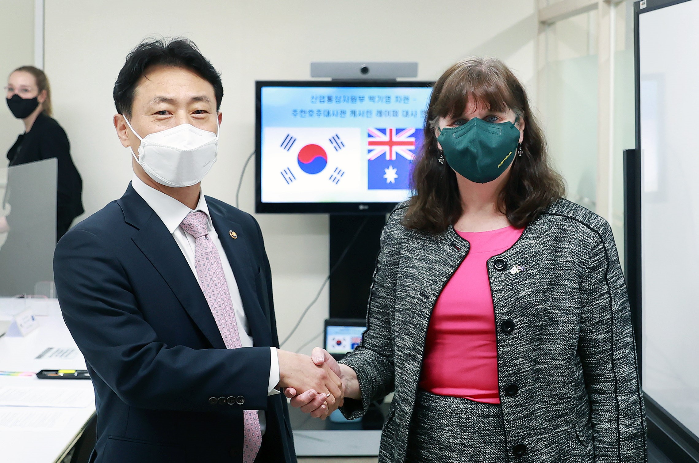 Trade, Industry and Energy 2nd Vice Minister Park Ki-young held talks with Australian Ambassador to the Republic of Korea Catherine Raper at the Government Complex Seoul on March 24 to discuss R&D, hydrogen, CCUS (Carbon, Capture, Utilization, and Storage), energy, resources, and supply chain cooperation measures. date2022-03-28