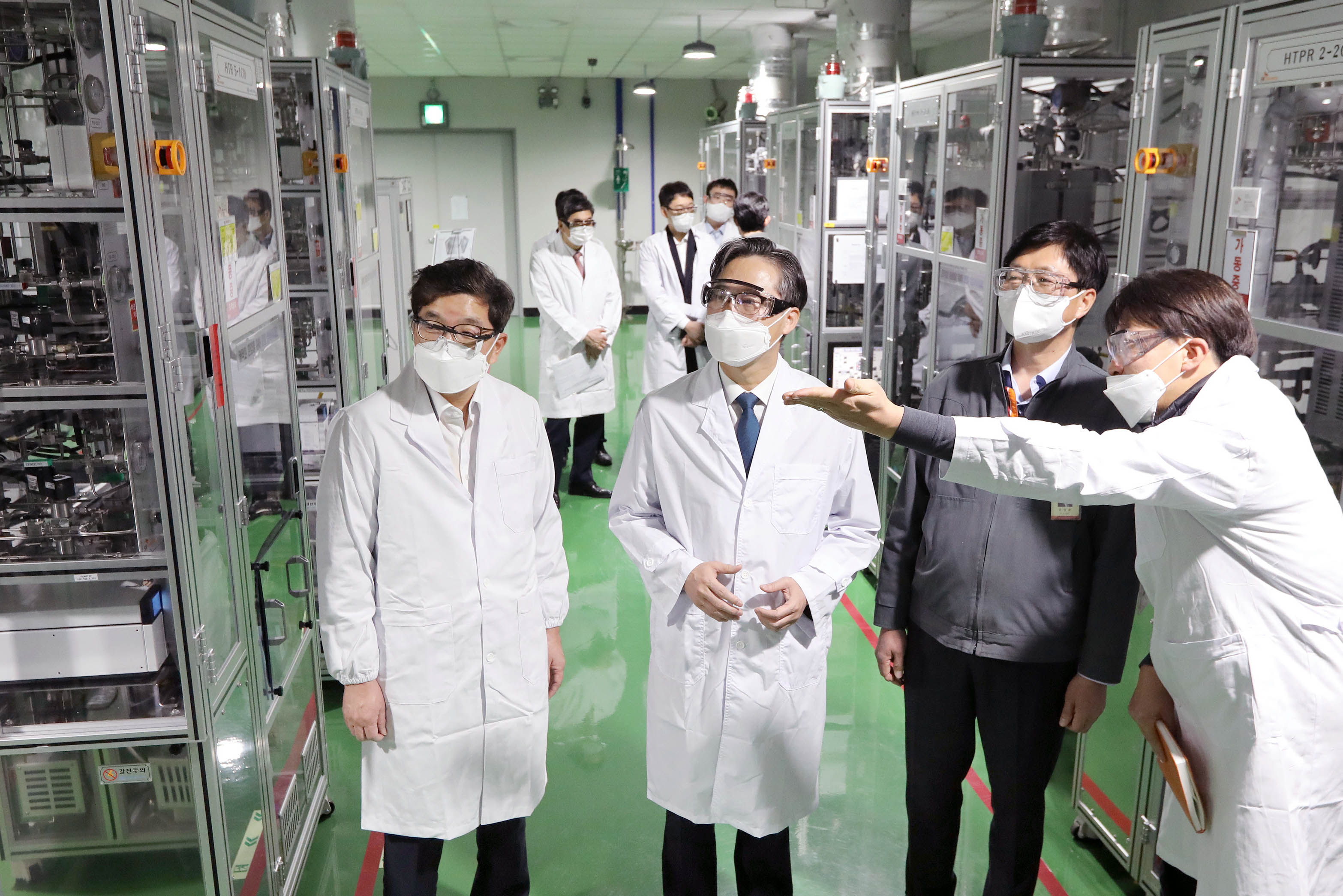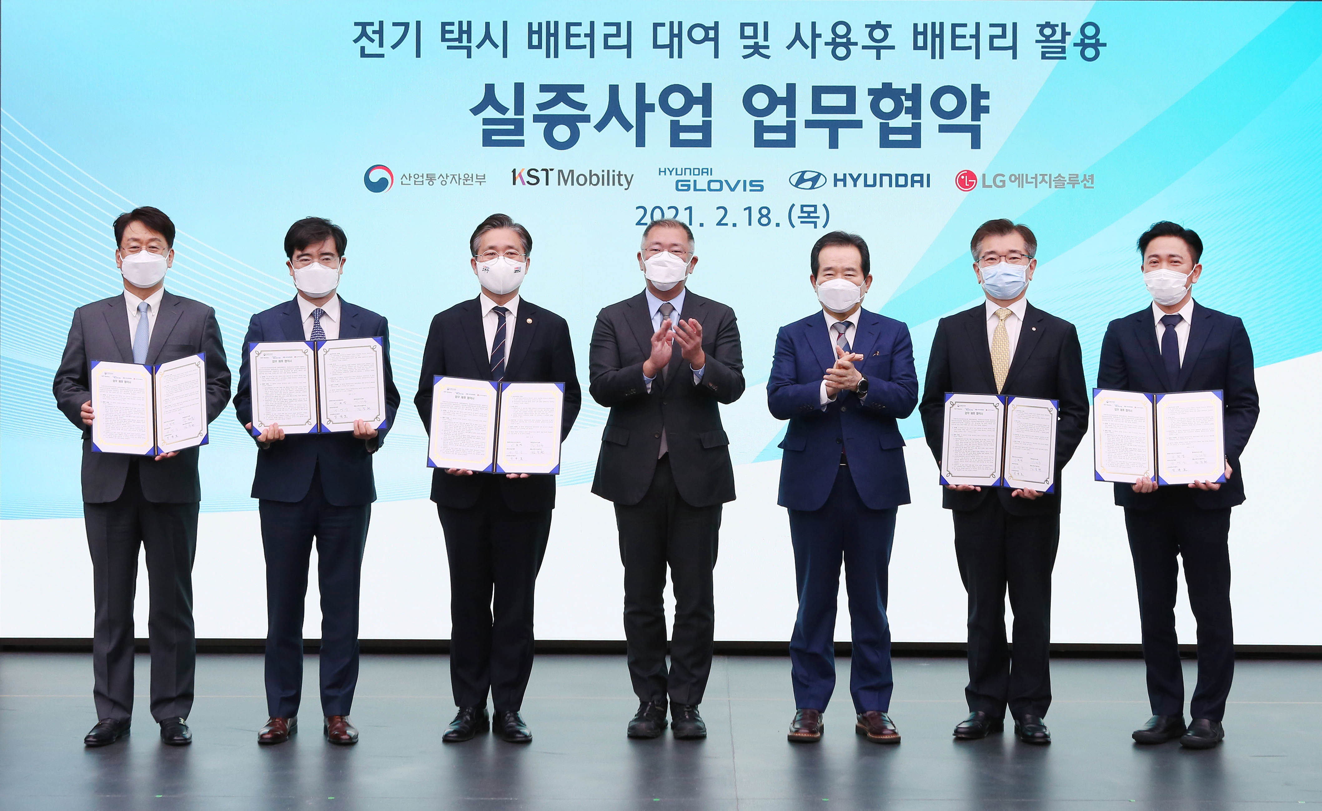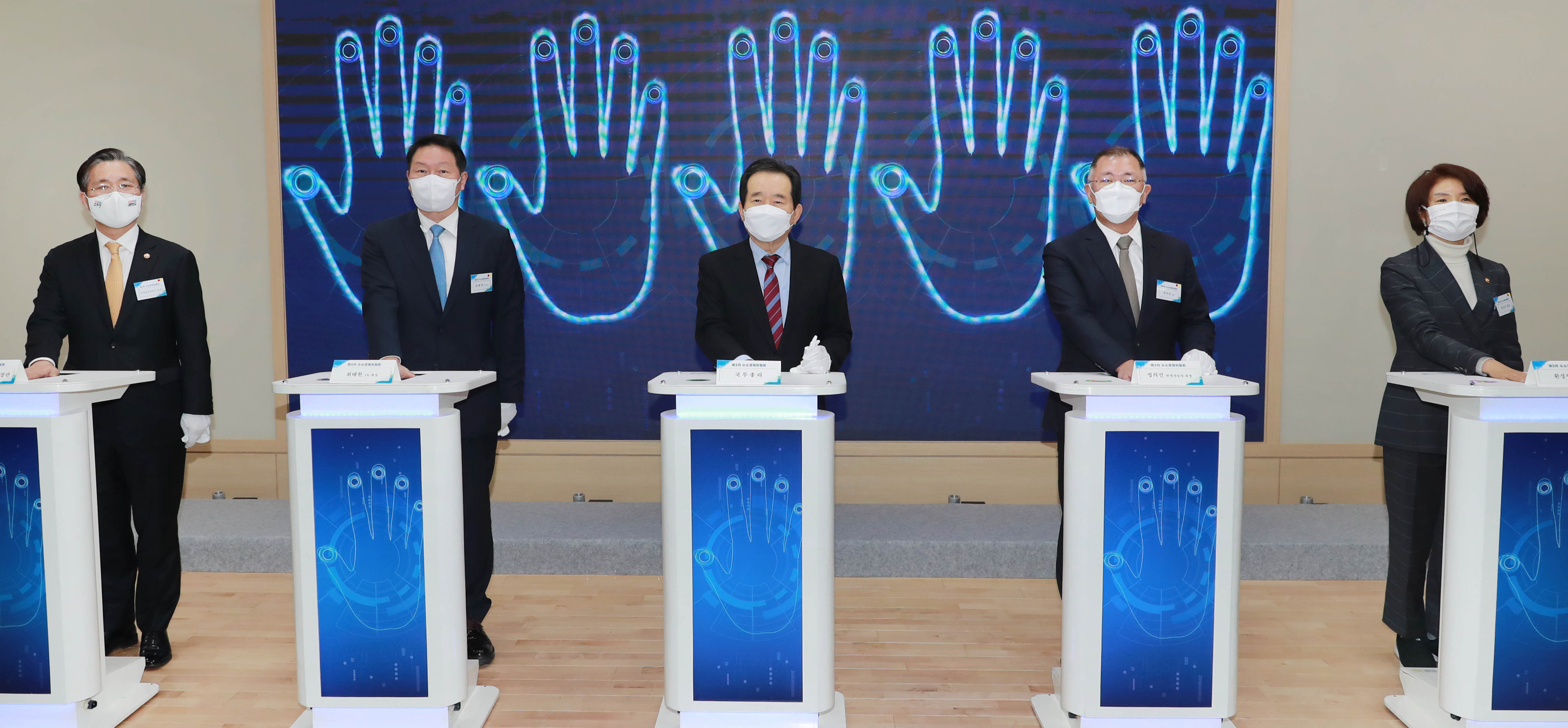 Trade, Industry and Energy Minister Sung Yunmo (third from the left) visited the Hyundai Kia Namyang Technology Research Center in Hwaseong, Gyeonggi Province, on February 18, to encourage leading innovators in the green car industry after discussing with government and industry representatives the fourth basic plan for eco-friendly vehicles. MOTIE signed a memorandum of understanding (MOU) with Hyundai Motor Company, Hyundai Glovis, LG Energy Solution, and KST Mobility to cooperate on date2021-02-18