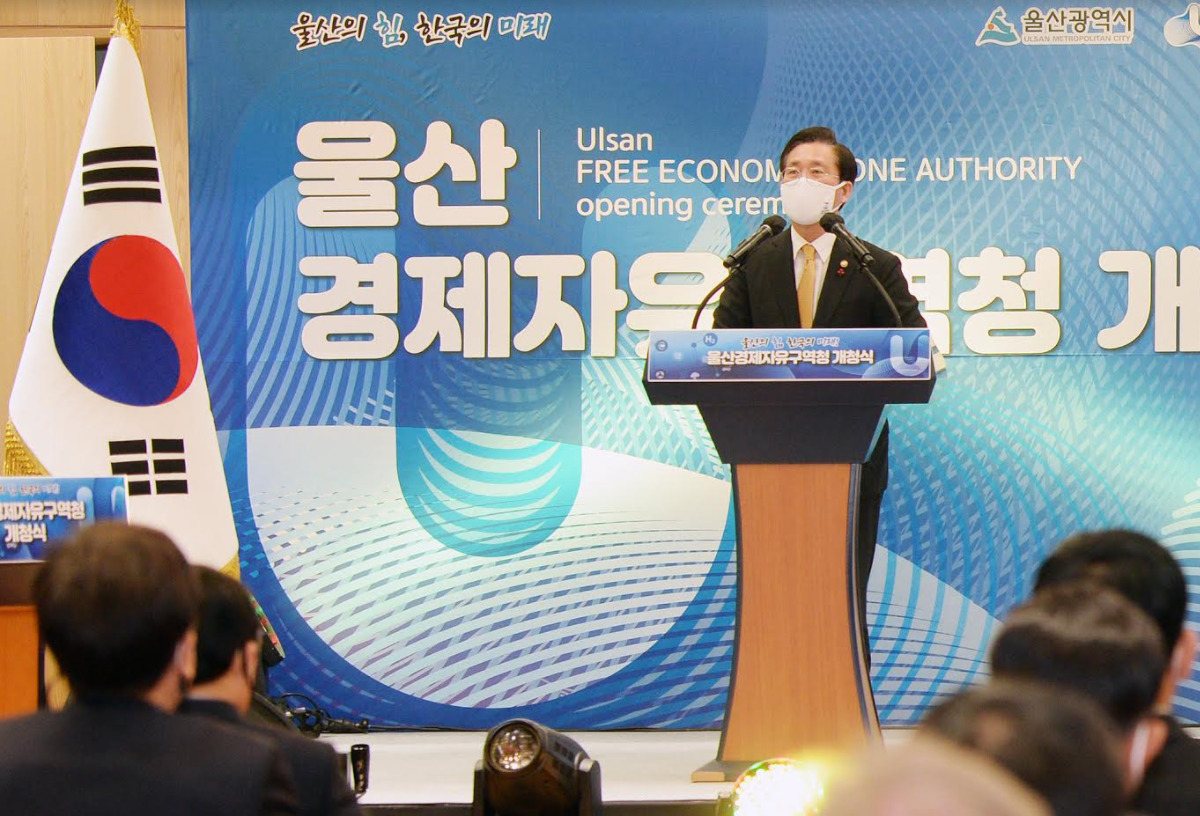 Trade, Industry and Energy Minister Sung Yunmo (center) attended the launching ceremony for the Ulsan Free Economic Zone Authority at Ulsan Metropolitan City Hall on January 14, and delivered a congratulatory speech to encourage the Authority’s vision to establish a hydrogen industry hub for innovative growth. Minister Sung mentioned that the UFEZ Authority has an important role in regional development and creation of jobs by fostering the new future hydrogen industry through the date2021-01-14