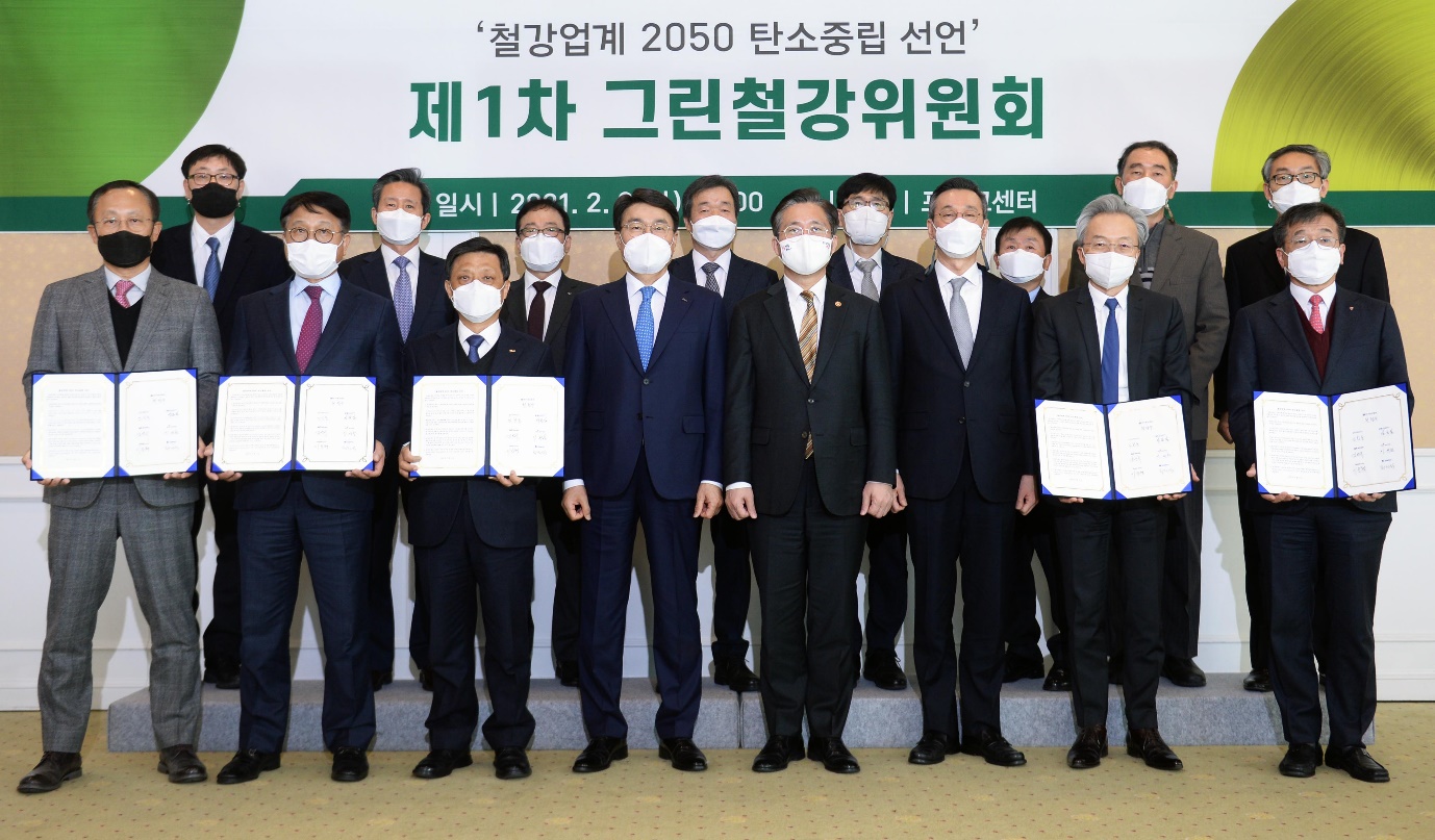 Trade, Industry and Energy Minister Sung Yunmo (fourth from the right) attended the launching ceremony for the Green Steel Committee at the Seoul POSCO Center on February 2, and encouraged the steel industry’s announcement of a joint statement to go carbon neutral by 2050. Minister Sung said that the Ministry will support the private sector’s participation in the carbon neutral initiative by establishing a special act to accelerate transition to a carbon neutral industrial structure date2021-02-02