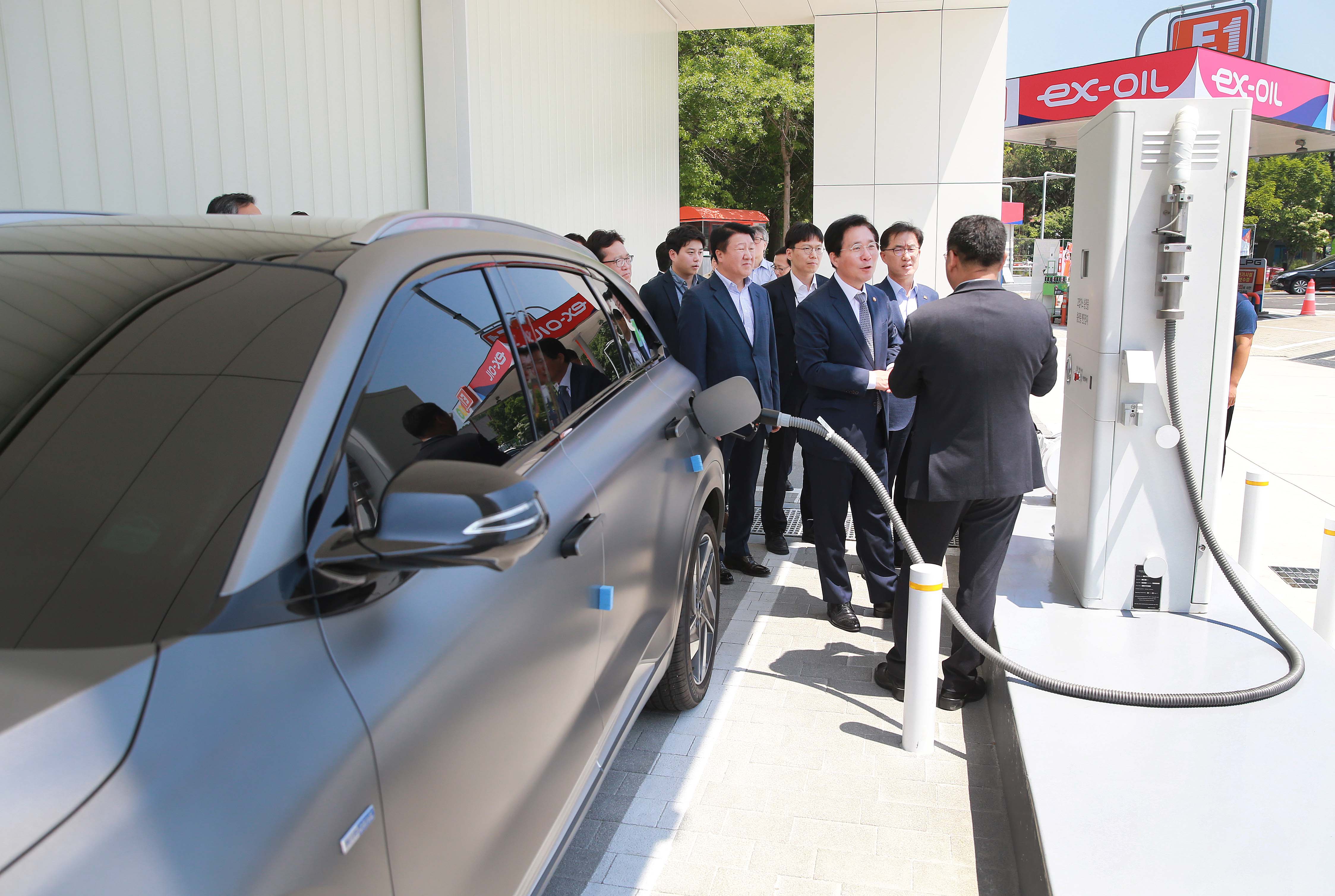 Trade, Industry and Energy Minister Sung visited a hydrogen fueling station in a rest area along an expressway in Anseong, south of Seoul, on May 23.Minister Sung charged his hydrogen vehicle for official use at the site after checking the status of the facility. date2019-05-23