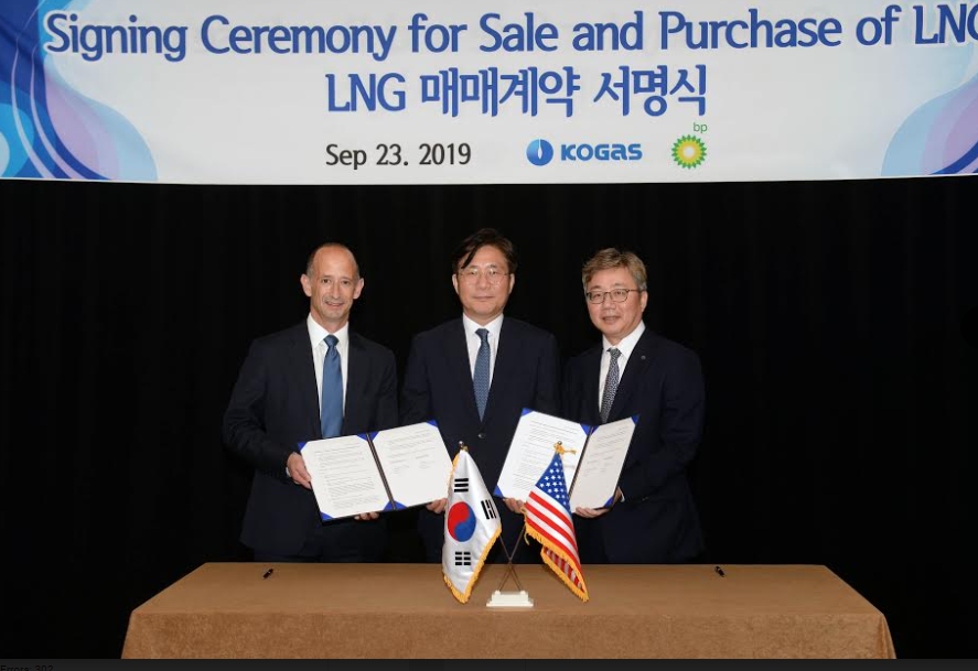 Trade, Industry and Energy Minister Sung Yun-mo (center) attended the signing ceremony held in New York, Sep 23, for a deal to buy liquefied natural gas (LNG) from the U.S. Under the deal, KOGAS will import 1.58 million tons of U.S. LNG from BP for up to 18 years. date2019-09-25