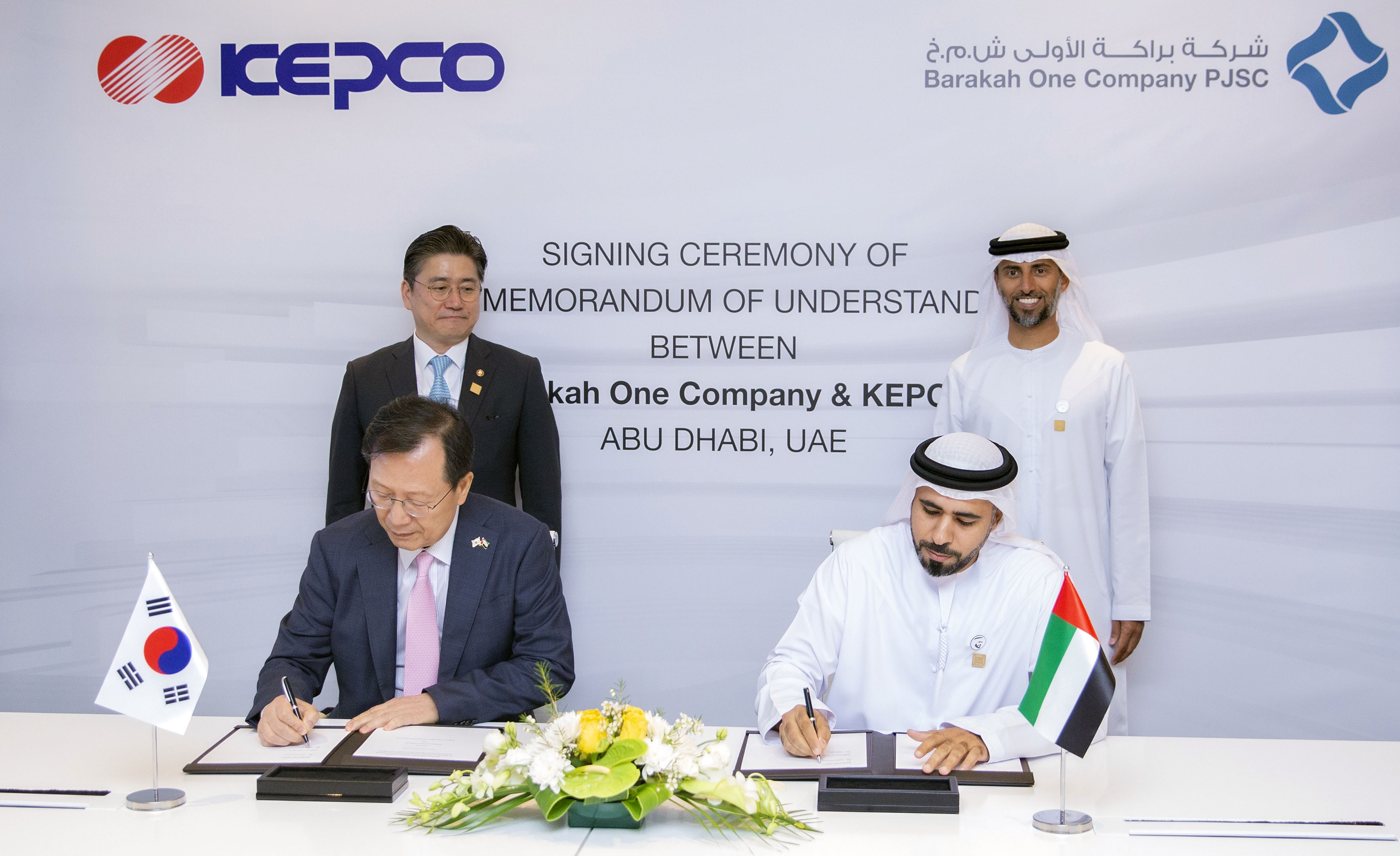 Trade, Industry and Energy Vice Minister Cheong Seung-il (left, back row) joined the MOU signing ceremony between KEPCO and Barakah One Company in Abu Dhabi on Sep 10. Under the agreement, the two countries will cooperate on securing new nuclear energy projects around the world. date2019-09-11