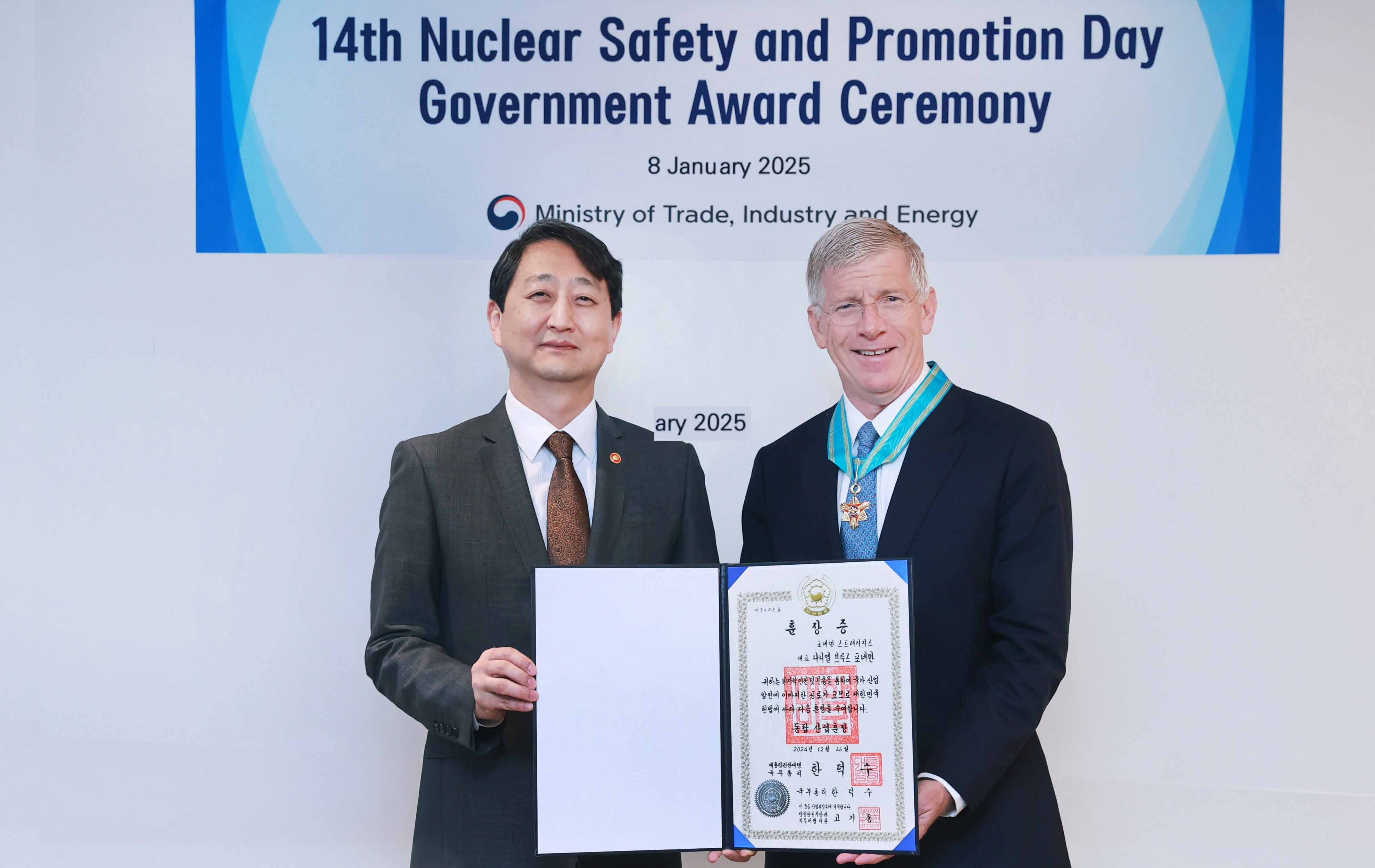Trade, Industry and Energy Minister Dukgeun Ahn of the Republic of Korea held talks with former U.S. Deputy Secretary of Energy Daniel Poneman on January 8 (local time) in Washington D.C. for discussions and presented the latter with the Bronze Tower Order of Industrial Service Merit for his contribution to establishing the Korea-U.S. nuclear fuel supply chain establishment and furthering bilateral nuclear energy policy and industrial cooperation. date2025-01-13