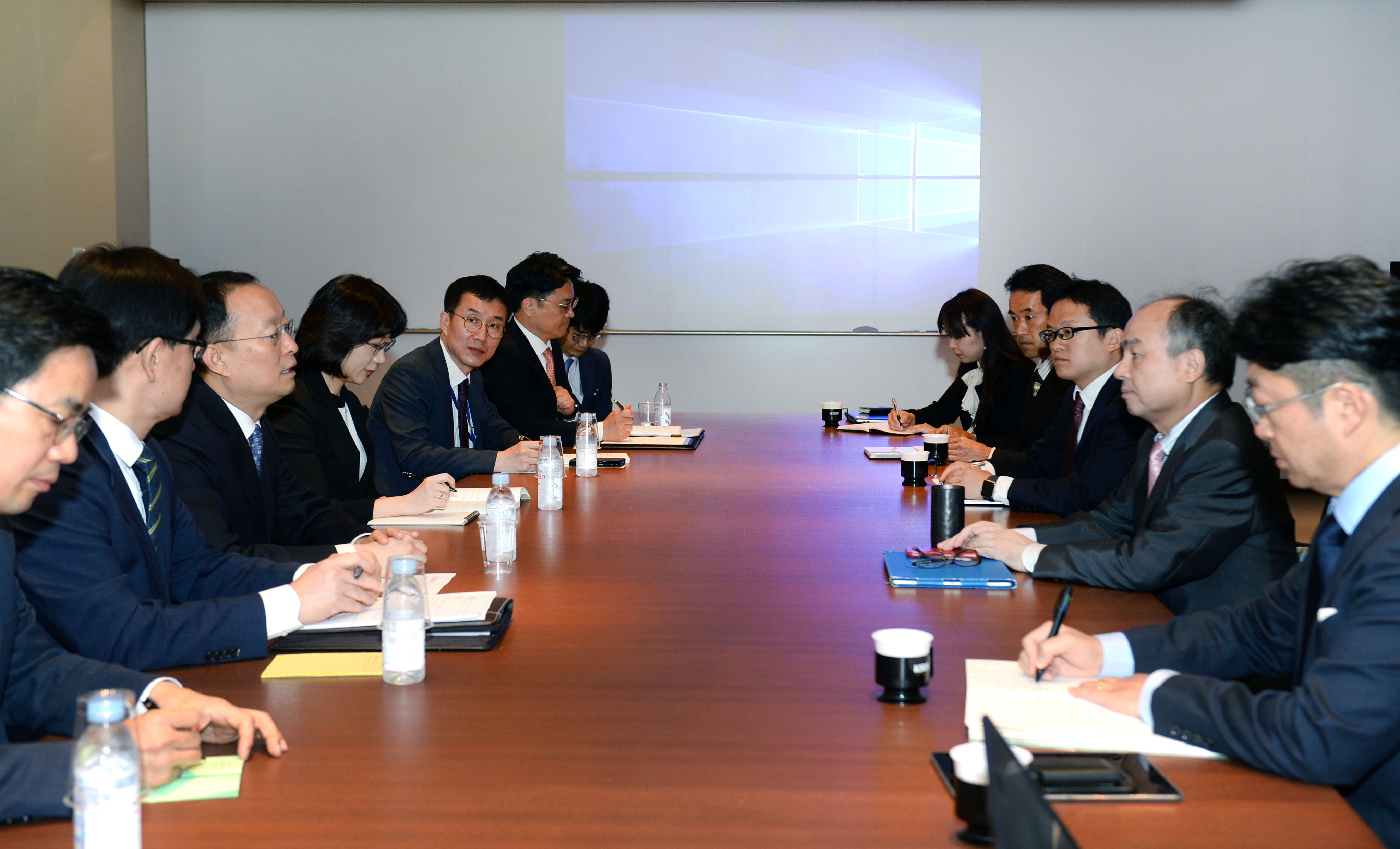 Trade, Industry and Energy Minister Paik Ungyu (third from left) discussed with SoftBank Group CEO Masayoshi Son (second from right) to seek energy cooperation during his visit to Tokyo, Japan, on May 8.During the meeting, Minister Paik and CEO Son exchanged views on various topics, including cooperation on renewable energies, construction of a Northeast Asia supergrid, and response to the Fourth Industrial Revolution (4IR).Minister Paik agreed with CEO Son about a significant decrease in the re date2018-05-08