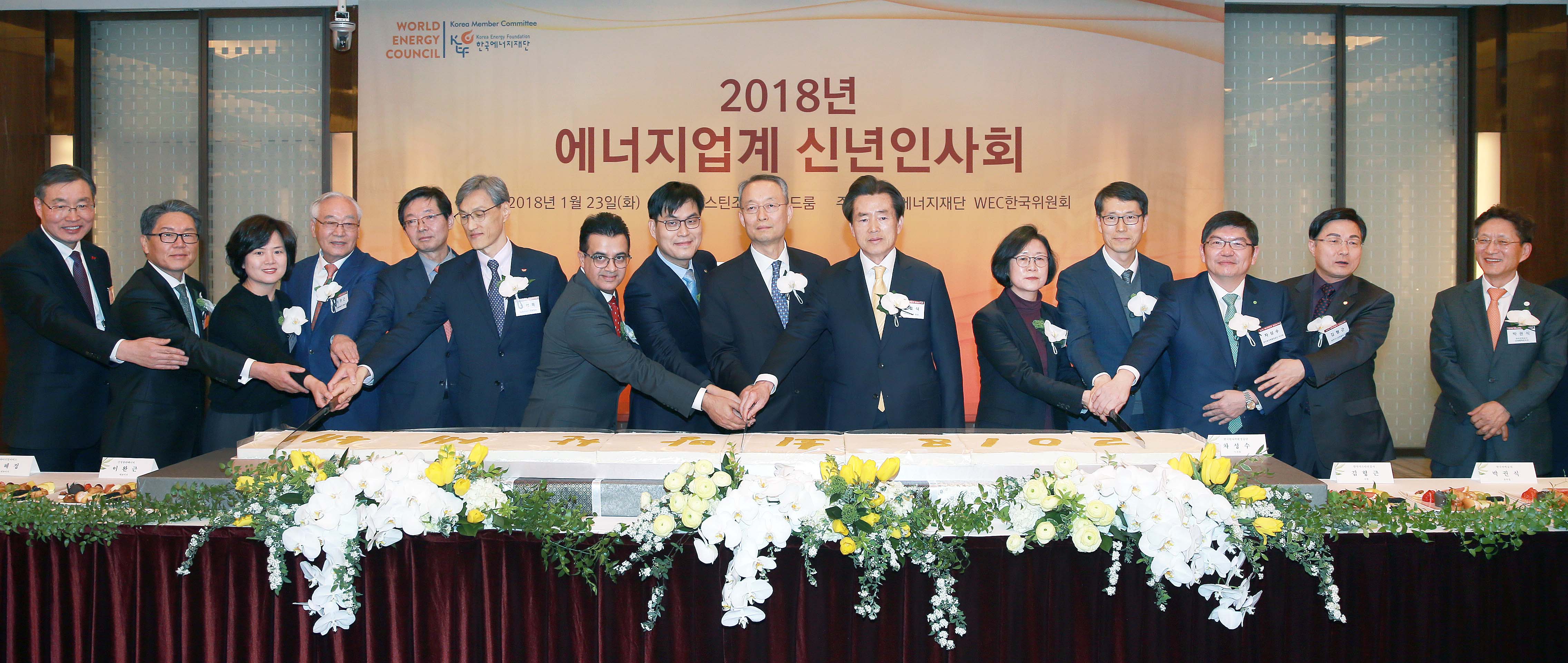 Trade, Industry and Energy Minister Paik Ungyu (seventh from right) posed for a photo with representatives of the energy sector during the New Year’s gathering with the industry at a hotel in downtown Seoul on January 23. The New Year’s gathering was arranged to encourage the energy industry and promote its further development. In his New Year’s address to the gathering, Minister Paik asked the energy industry to expand investment to help create new markets in response date2018-01-24