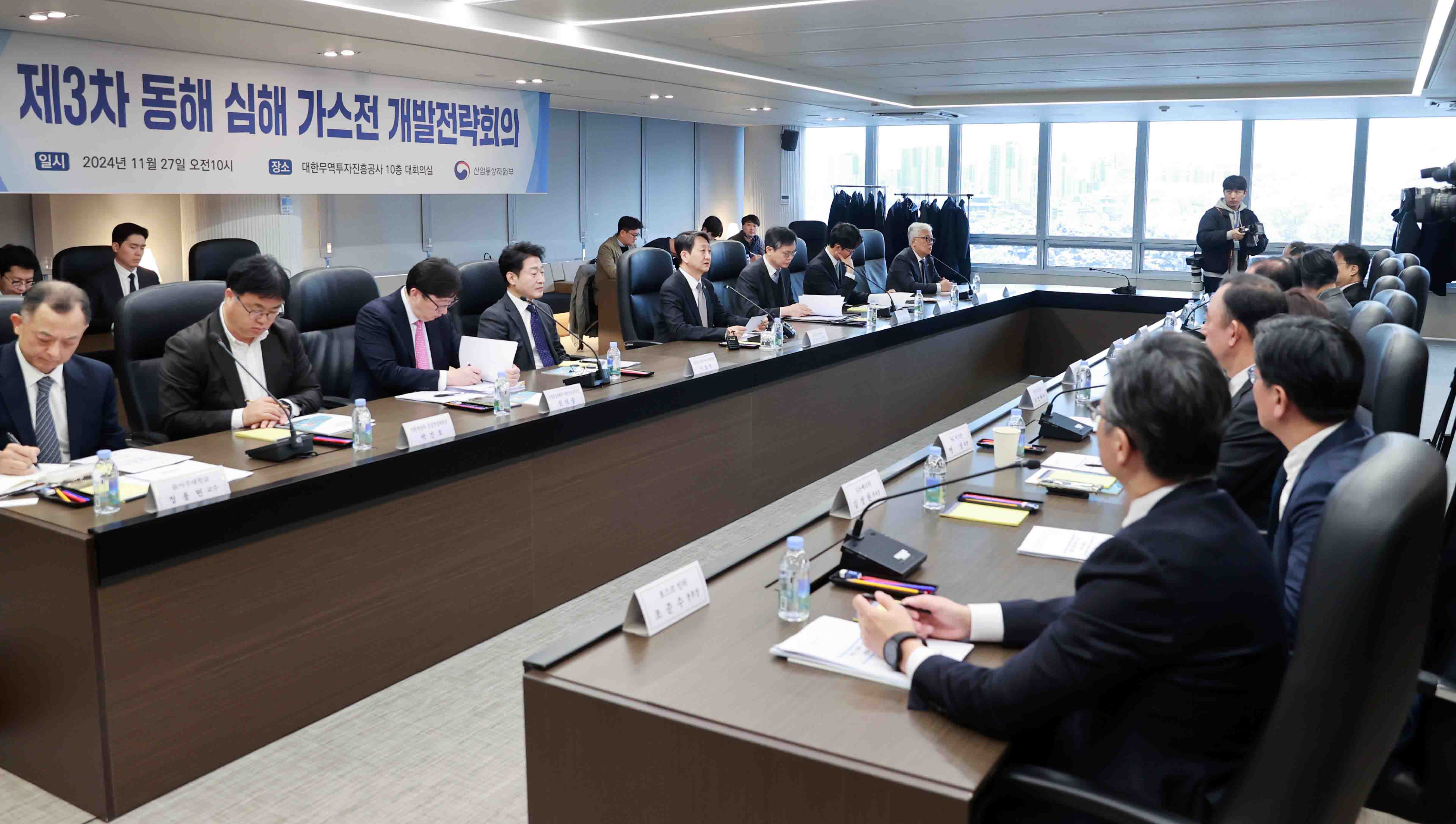 Korea’s Minister for Trade, Industry and Energy Dukgeun Ahn chaired the third strategy meeting on East Sea deep-sea gas field development on November 27 at the Korea Trade-Investment Promotion Agency (KOTRA) in Seoul, where attendees agreed to give final approval on the Korea National Oil Corporation (KNOC)'s drilling plan for Block 8 and the northern part of Block 6-1 of the gas field, referred to as the “Blue Whale.” The meeting was attended by relevant ministries, national policy research institutes, academia, resource institutions, and private companies. date2024-11-27
