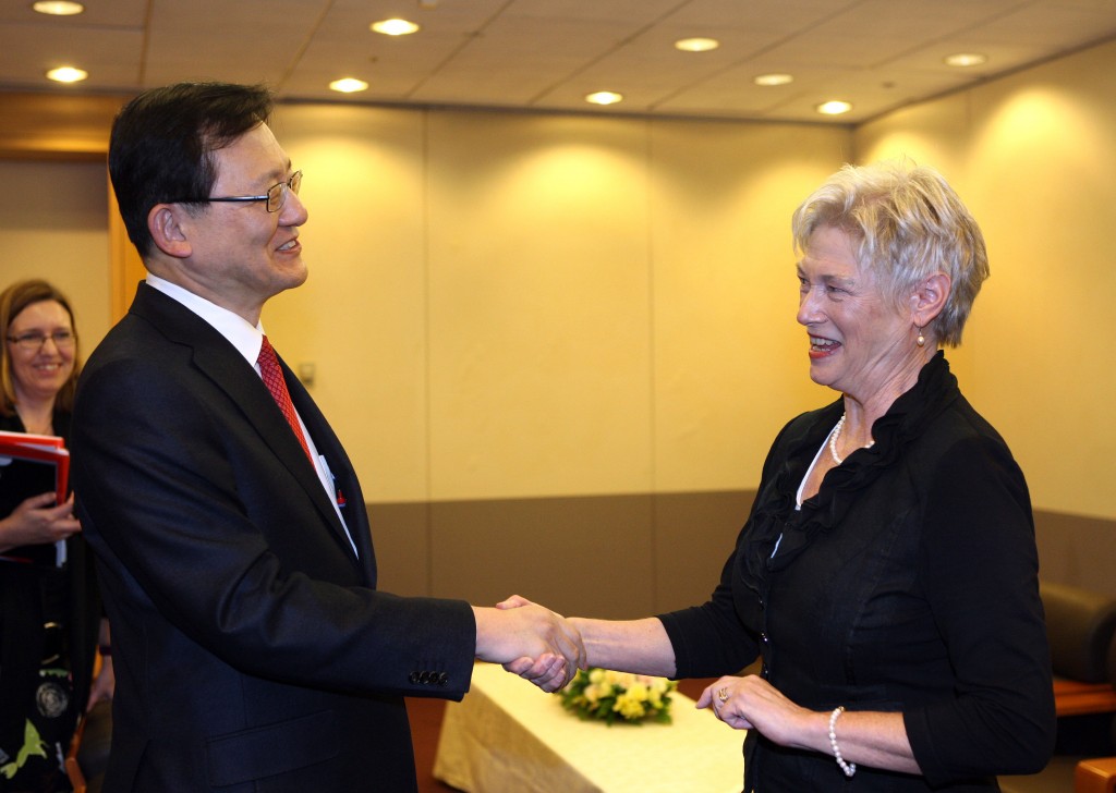 Minister of Knowledge Economy Sukwoo HONG shakes hands with the Executive Director of the International Energy Agency, Maria van der Hoeven on November 23 in Seoul. date2012-11-29