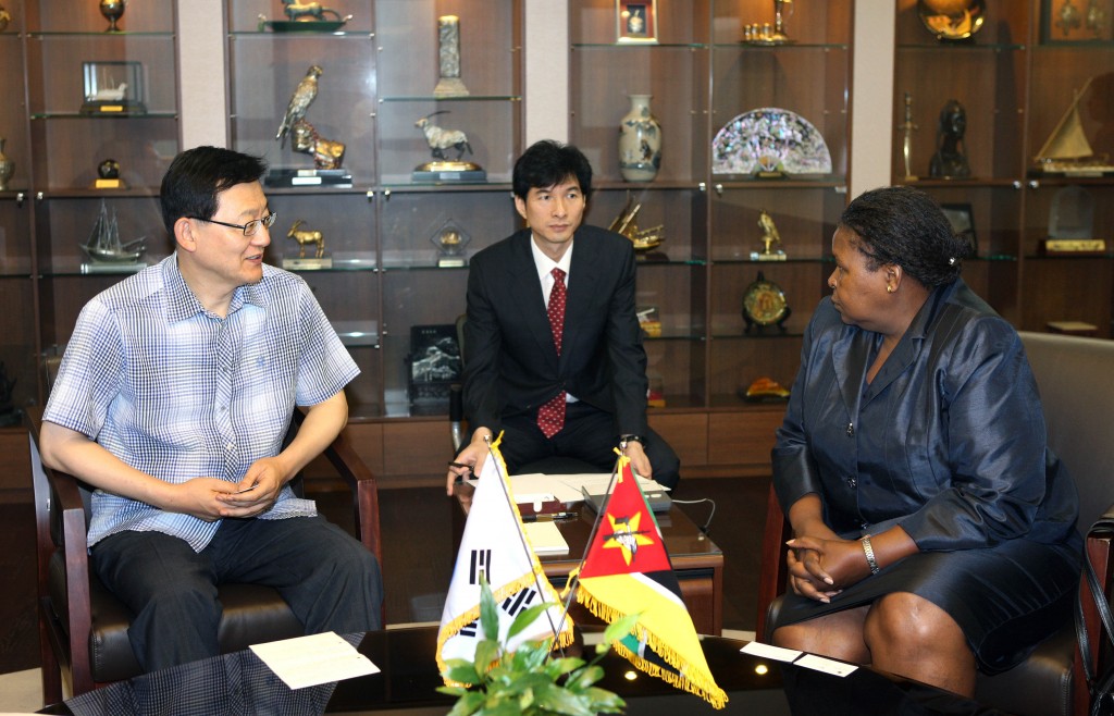 Minister of Knowledge Economy Sukwoo HONG greets his Mozambican counterpart, Minister of Mineral Resources Esperança Bias, on August 10 at the Gwacheon Government Complex. The two officials talked about ways to strengthen cooperation on industrial development and how to support mineral resources exploration projects. date2012-08-21