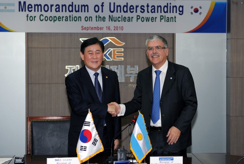 Minister of Knowledge Economy Choi Kyunghwan shakes hands with Argentinean Minister of Federal Planning, Public Investment and Services Julio de Vido on September 16 in Gwacheon, south of Seoul. The two Ministers had just signed an MOU establishing a nuclear partnership between the two countries. date2010-10-01