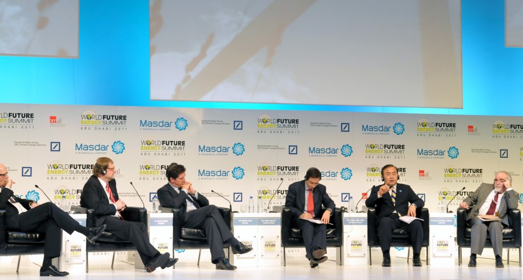 Vice Minister for Trade and Energy Park Young June (second from right) sits with other dignitaries at the World Energy Summit on January 17 in Abu Dhabi. Vice Minister Park shared his opinions on pressing energy issues with delegates from India, Germany, Ireland, Portugal, Bangladesh, Georgia and Pakistan. date2011-02-01
