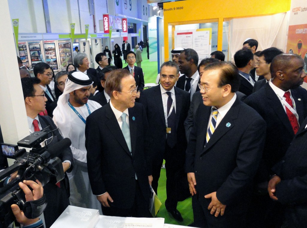 Vice Minister for Trade and Energy Park Young June (right) talks with United Nations Secretary General Ban Ki-moon at an energy exhibition on January 17 in Abu Dhabi. The event, which featured future energy technologies from nearly 600 companies, was part of World Future Energy Summit. date2011-02-01