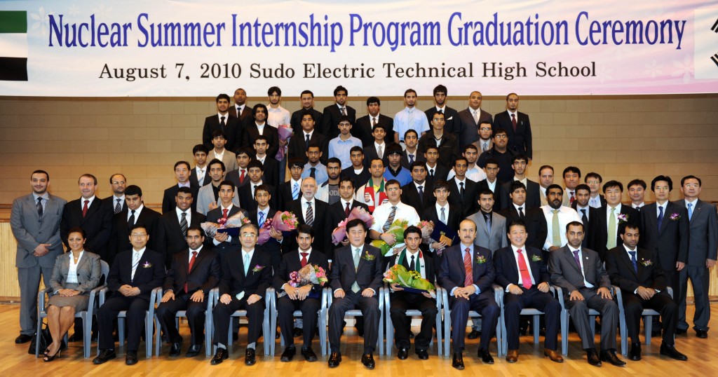 Minister of Knowledge Economy Choi Kyunghwan (center, first row) is pictured with a group of UAE students at their graduation ceremony from a summer internship program in Korea. The aim of the program is to prepare students for careers in the field of nuclear energy. date2010-08-11