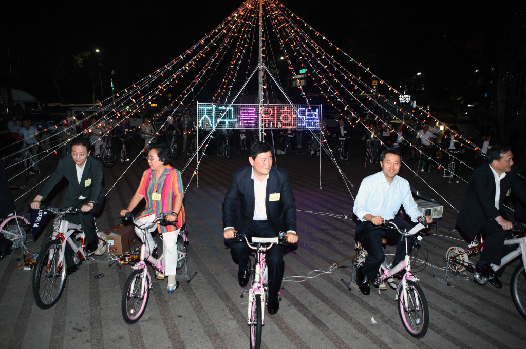 Minister of Knowledge Economy Choi Kyunghwan (center) poses with other dignitaries in Seoul on August 17 as part of an energy conservation campaign. Nearly 250 civic groups held various events to encourage the public to save energy—for example, by turning off the air conditioning for an hour. date2010-08-25