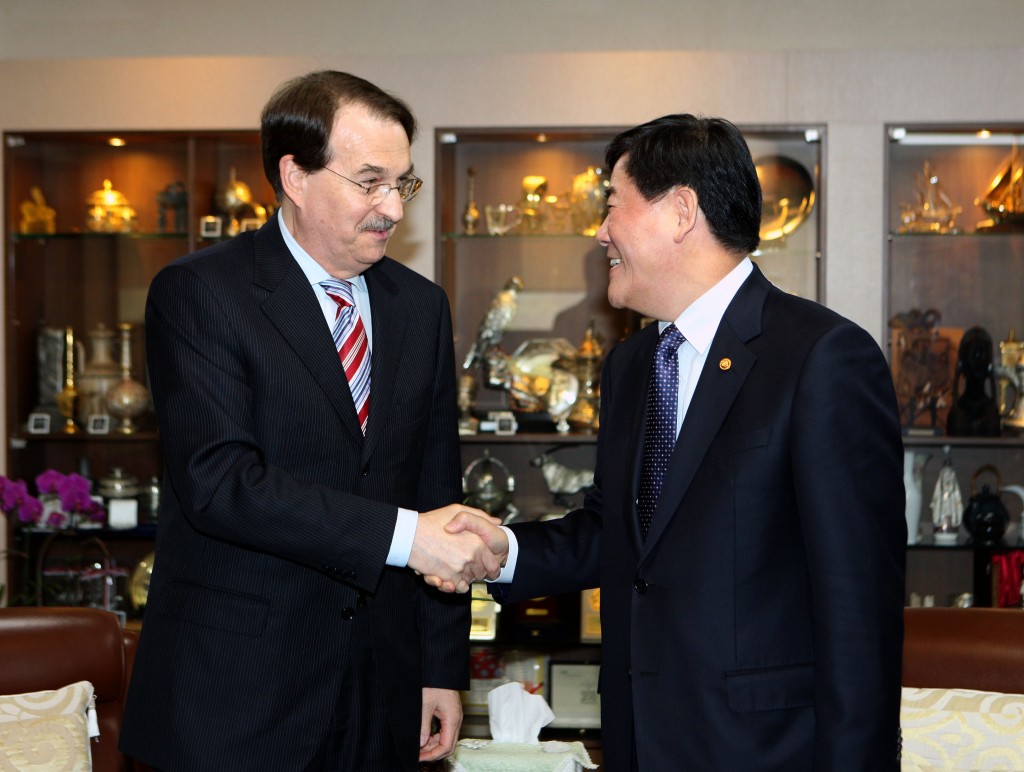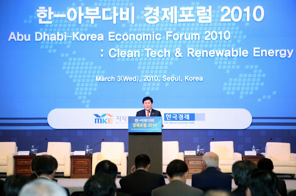 Minister of Knowledge Economy Choi Kyunghwan welcomes delegates from the United Arab Emirates at a business forum on March 3 in Seoul. Delegates represented numerous sectors including construction, power generation, renewable energy, finance and investment. date2010-03-10